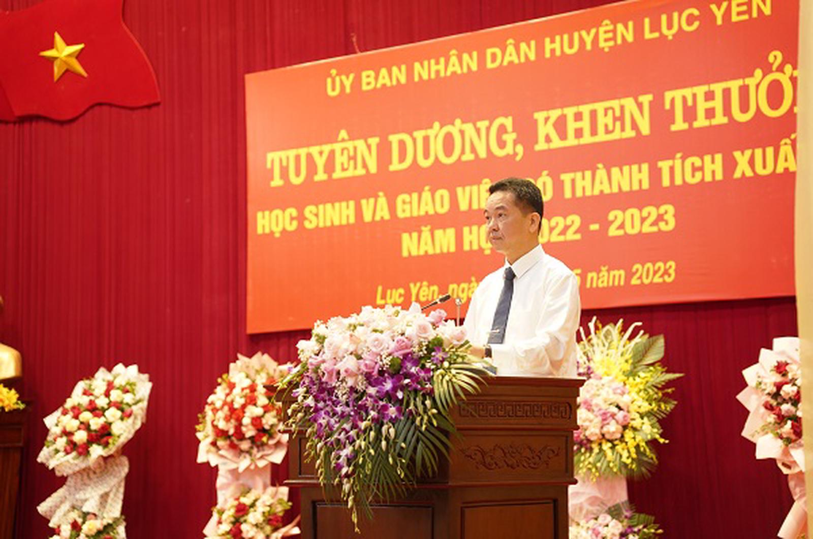 Ông Đinh Khắc Yên, Chủ tịch UBND huyện Lục Yên ghi nhận và biểu dương những nỗ lực, cố gắng của các thầy cô giáo và các em học sinh. Ảnh: Bùi Bình
