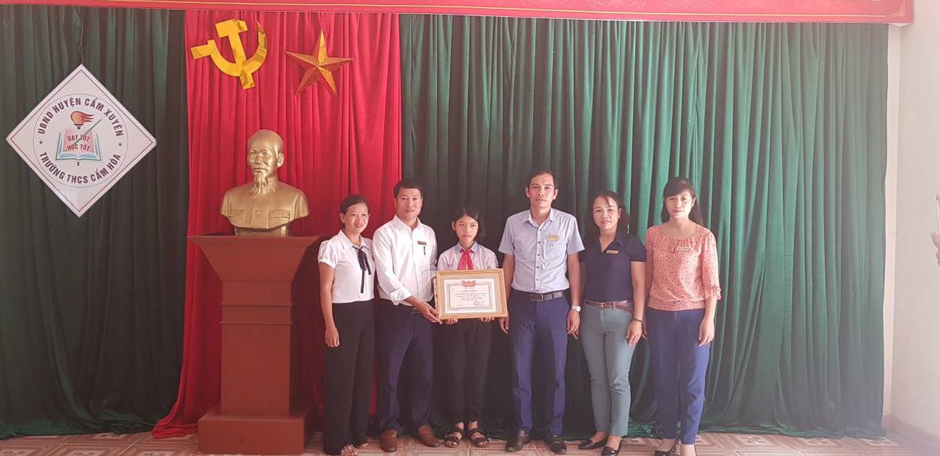 Ban Giám hiệu Trường THCS Cẩm Hoà tuyên dương và trao quà cho em Trần Thị Tùng Lâm. Ảnh: HY