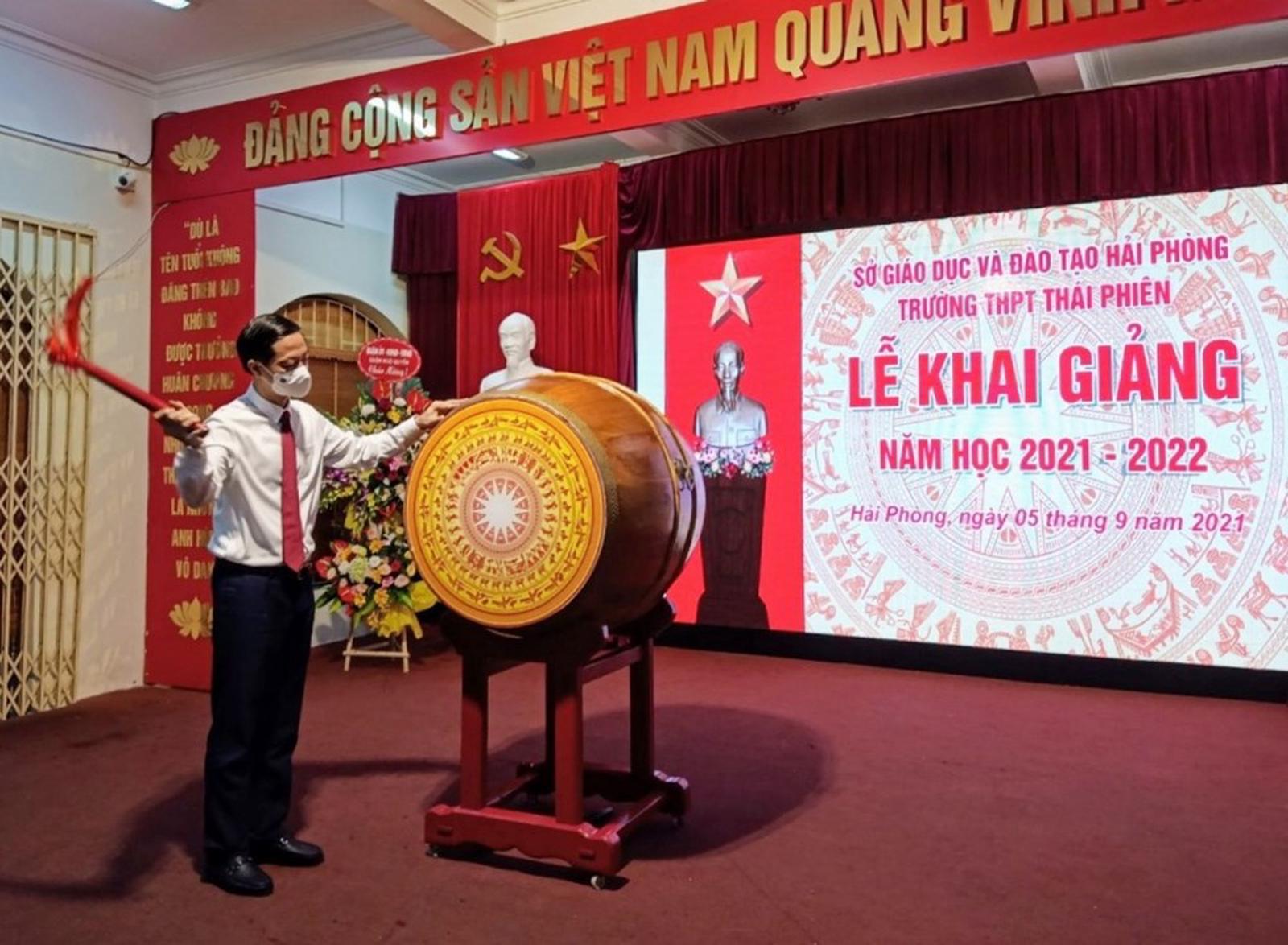 Chủ tịch UBND thành phố Nguyễn Văn Tùng đánh trống khai giảng năm học 2021 - 2022 tại Trường THPT Vĩnh Bảo. Ảnh: HT
