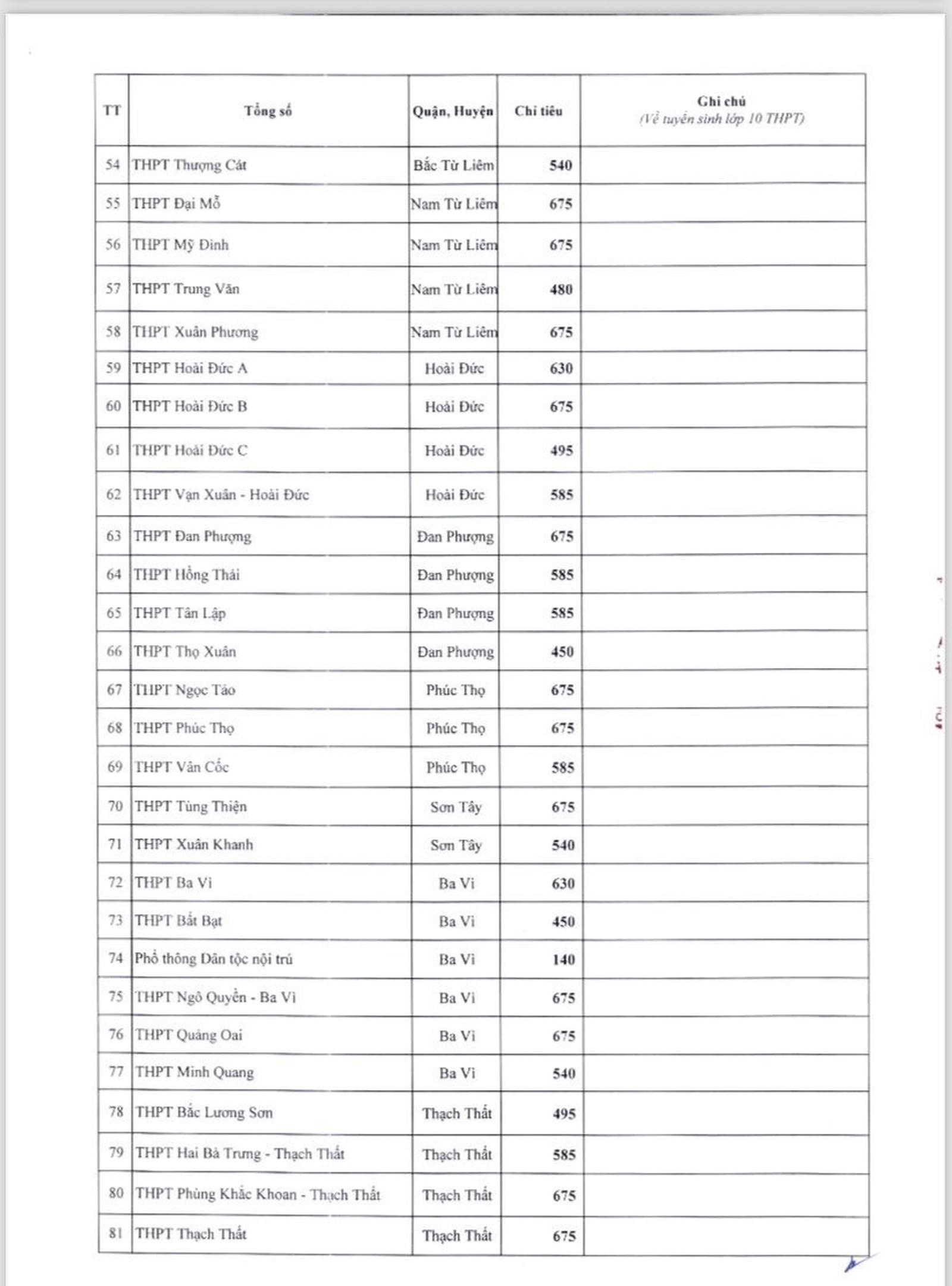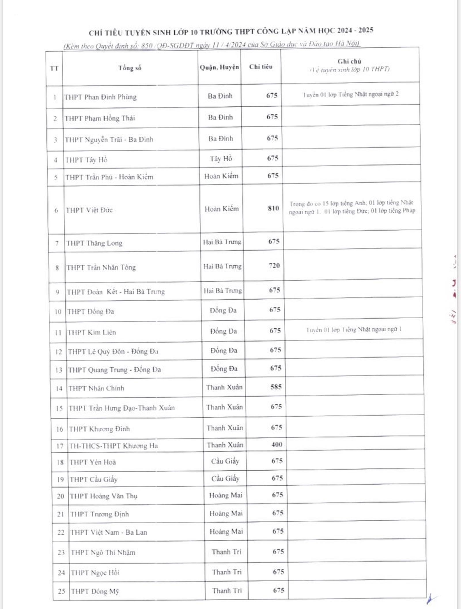 Về cơ bản, chỉ tiêu cho các nhóm trường không có biến động lớn. Trường có chỉ tiêu tuyển sinh cao nhất là THPT Việt Đức (Hoàn Kiếm) với 810 chỉ tiêu (tương đương năm 2023); trường được giao ít chỉ tiêu tuyển sinh nhất là THPT Sơn Tây (thị xã Sơn Tây) với 270 chỉ tiêu.