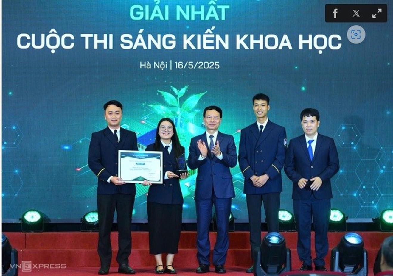 Bộ trưởng Khoa học và Công nghệ Nguyễn Mạnh Hùng trao giải Nhất cho nhóm nhà khoa học không chuyên đến từ Trường Đại học Hàng hải Việt Nam