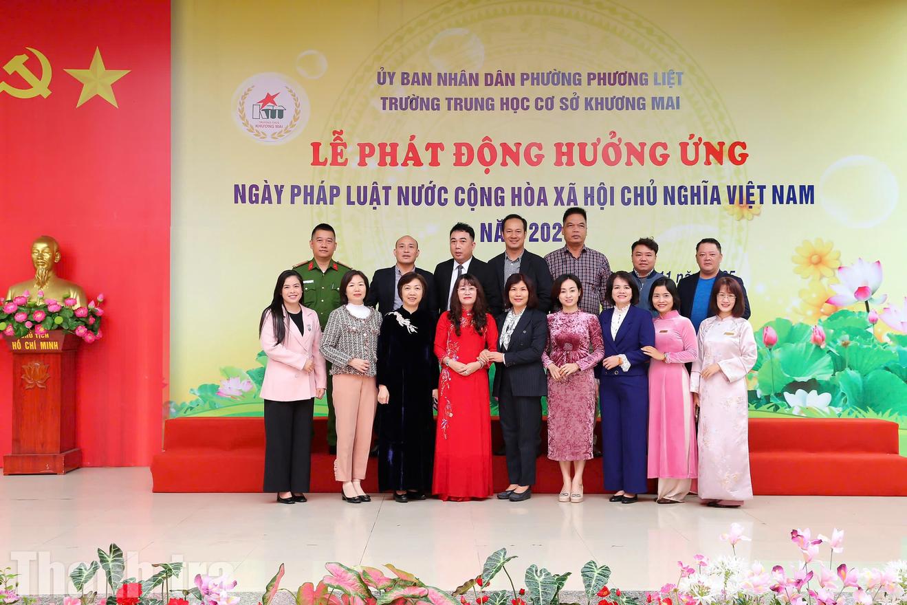 Các thầy cô giáo, đại biểu và các khách mời chụp ảnh lưu niệm tại Lễ phát động hưởng ứng Ngày Pháp luật Việt Nam. Ảnh: Lan Anh.