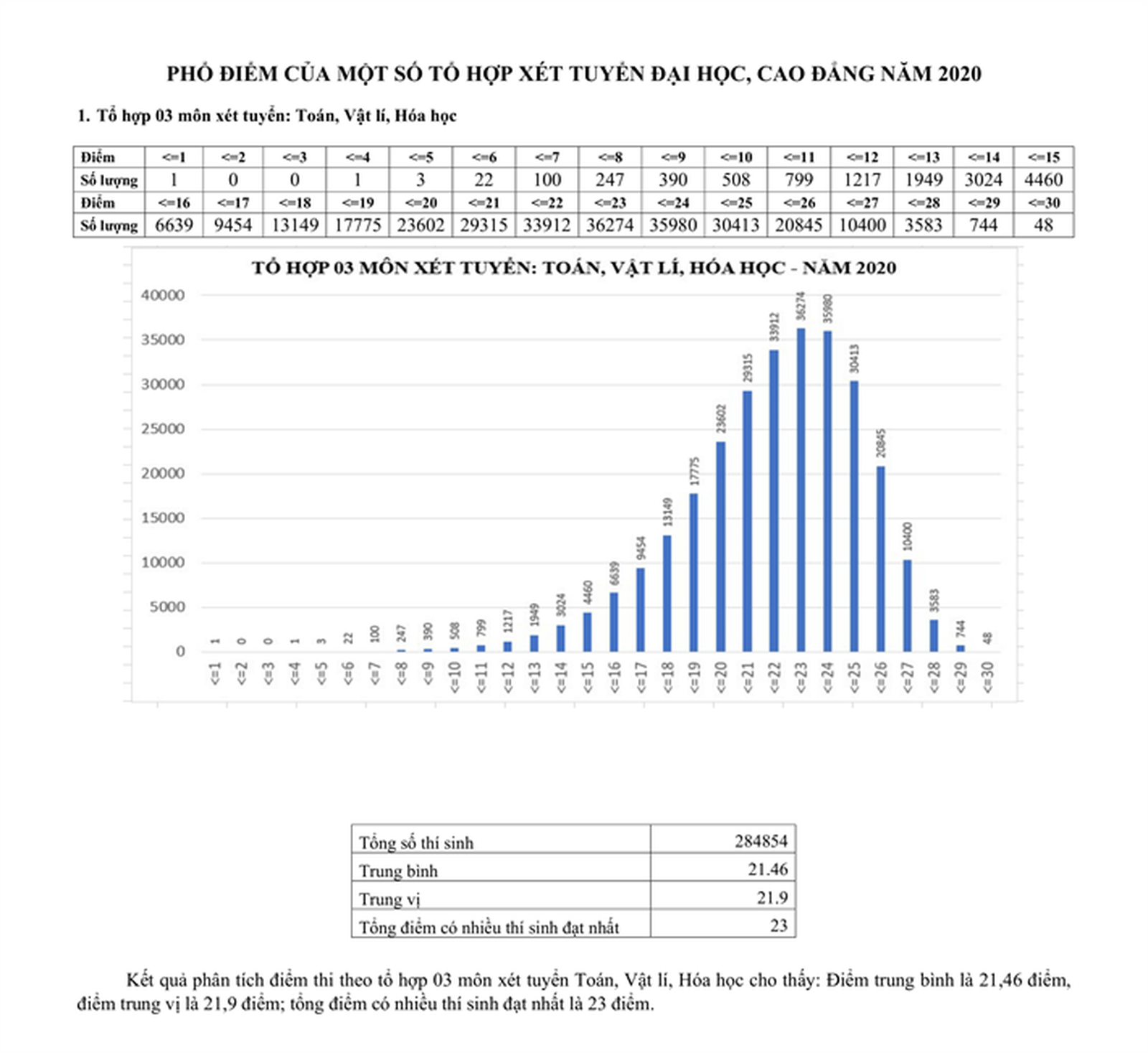 Tổ hợp 3 môn xét tuyển Toán, Vật lí, Hóa học cho thấy, điểm trung bình là 21,46 điểm, điểm trung vị là 21,9 điểm; tổng điểm có nhiều thí sinh đạt nhất là 23 điểm.