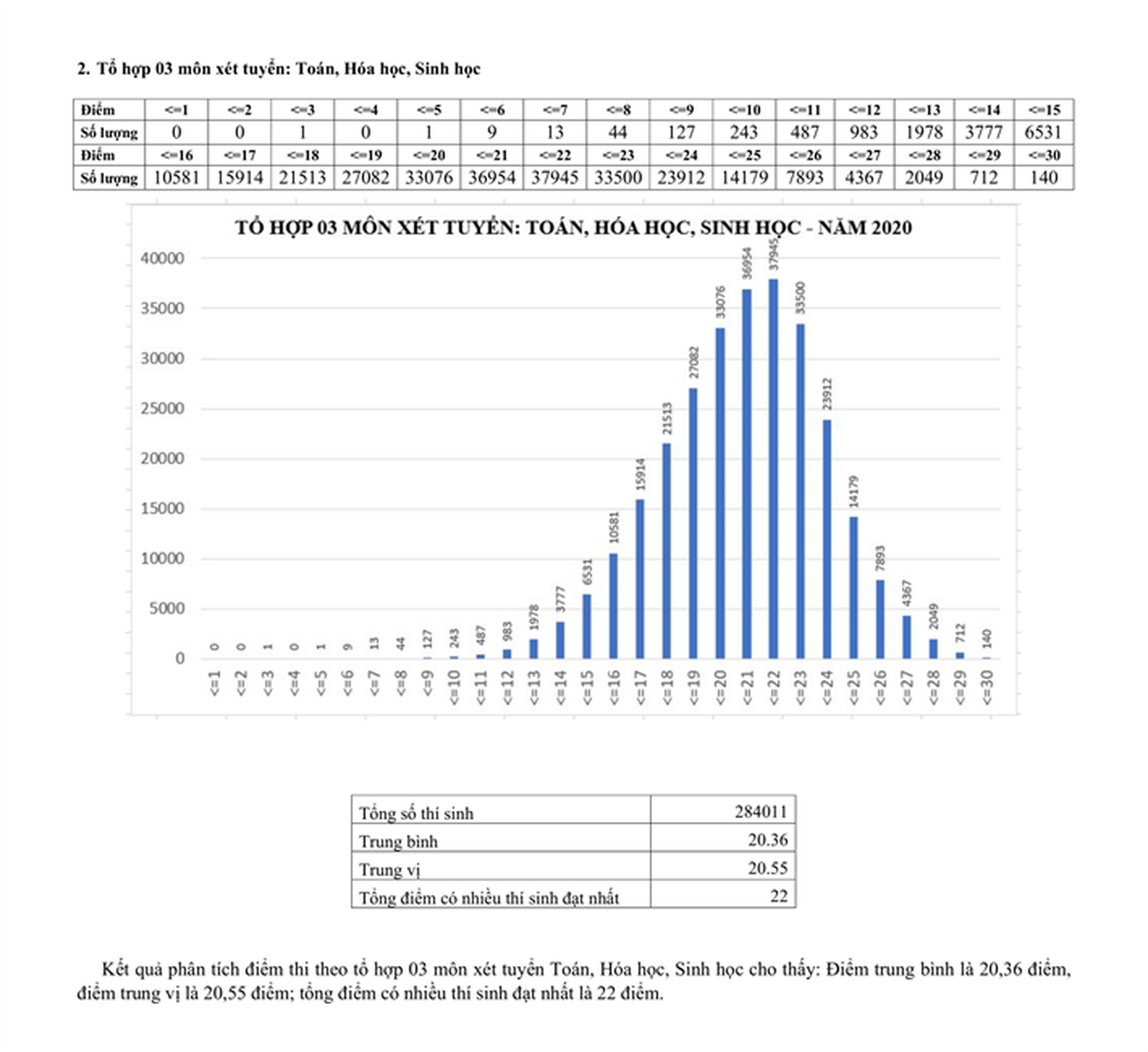 Tổ hợp 3 môn xét tuyển Toán, Hóa học, Sinh học, điểm trung bình là 20,36 điểm, điểm trung vị là 20,55 điểm; tổng điểm có nhiều thí sinh đạt nhất là 22 điểm.