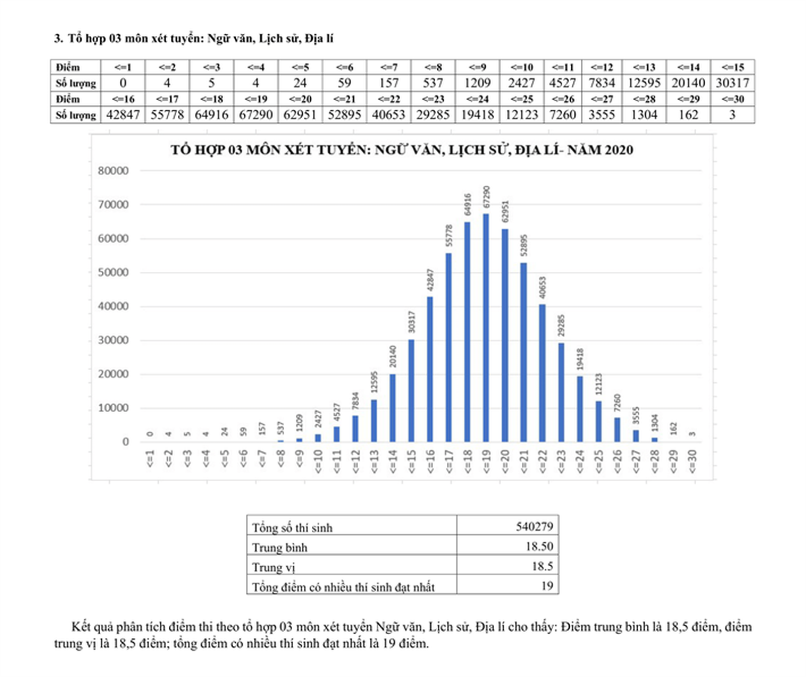 Tổ hợp 3 môn xét tuyển Ngữ văn, Lịch sử, Địa lí, điểm trung bình là 18,5 điểm, điểm trung vị là 18,5 điểm; tổng điểm có nhiều thí sinh đạt nhất là 19 điểm.