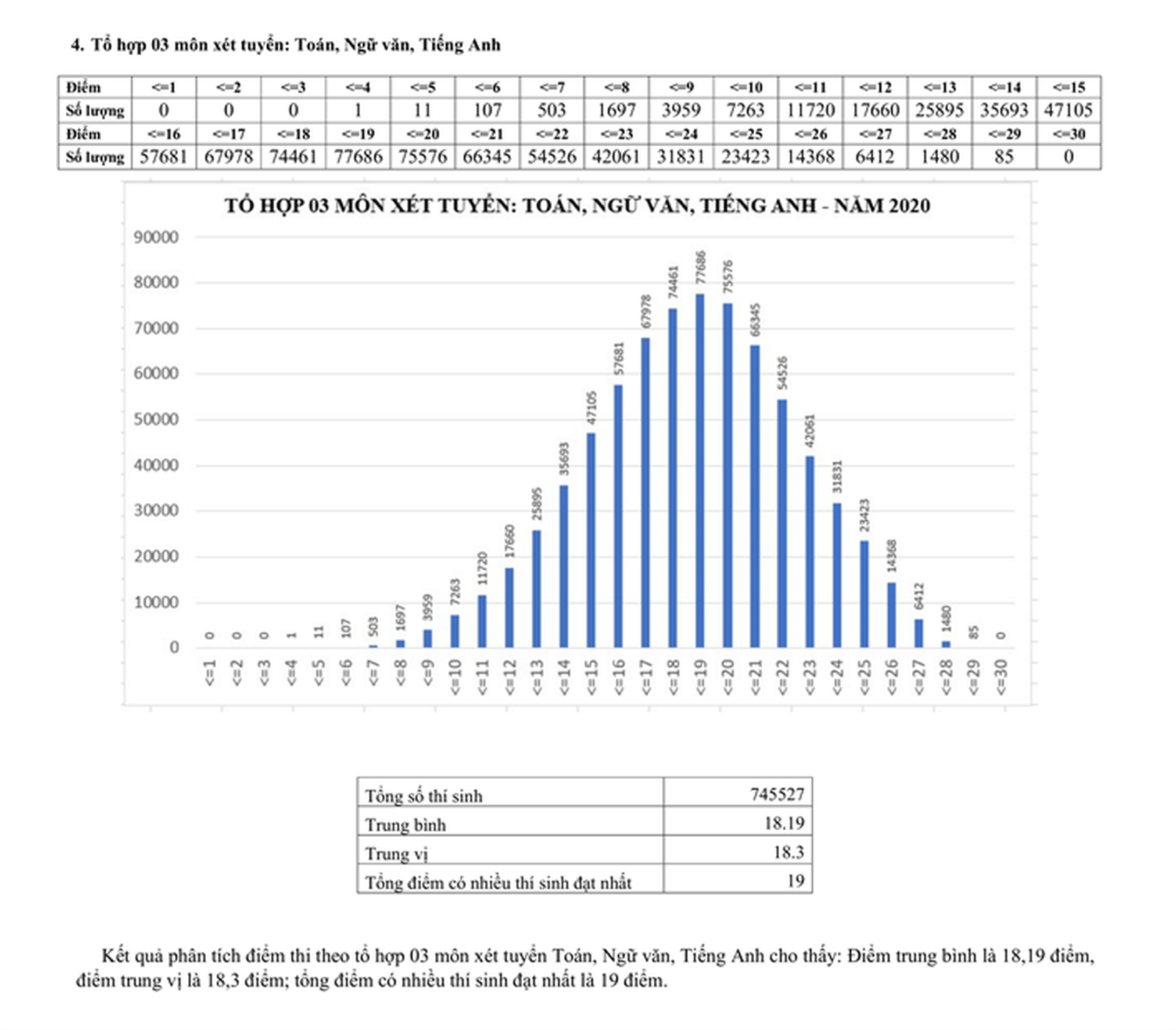Tổ hợp 3 môn xét tuyển Toán, Ngữ văn, Tiếng Anh, điểm trung bình là 18,19 điểm, điểm trung vị là 18,3 điểm; tổng điểm có nhiều thí sinh đạt nhất là 19 điểm.