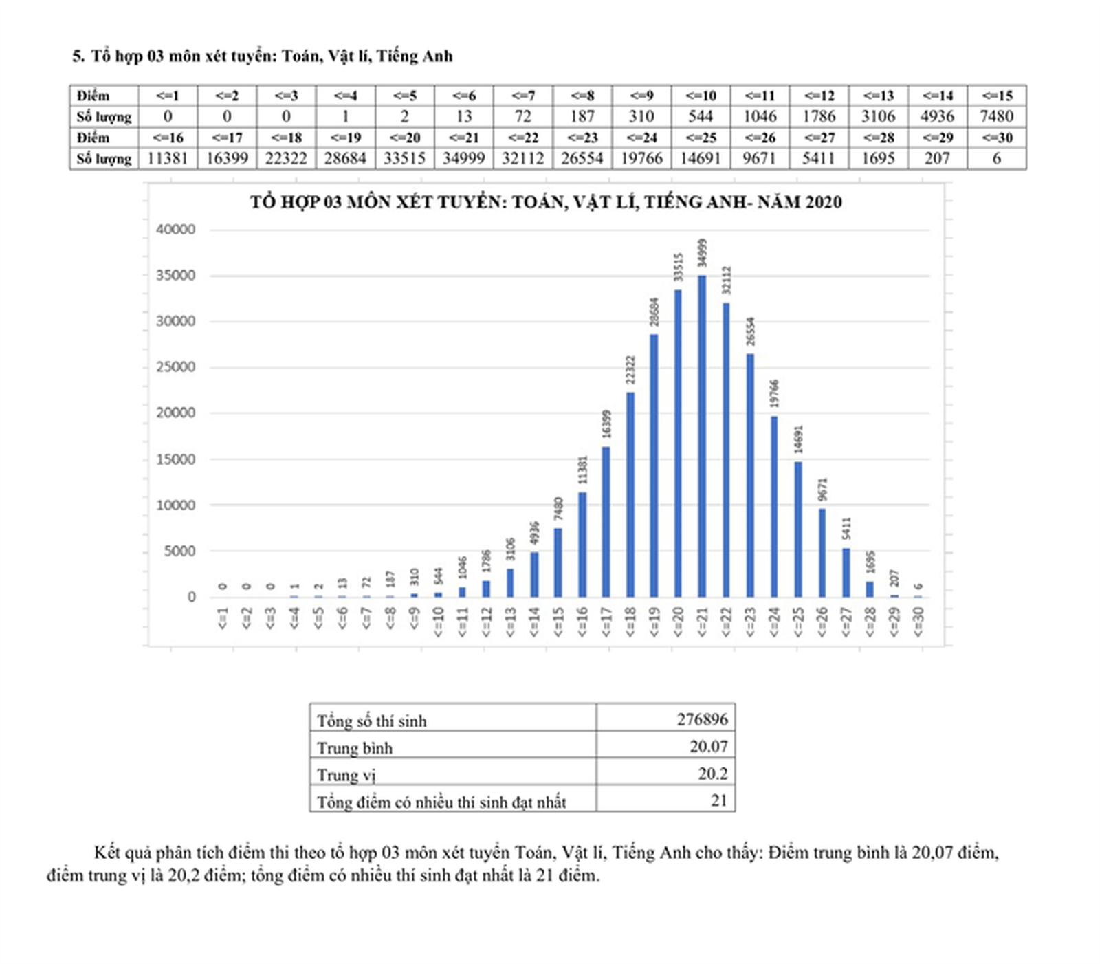 Tổ hợp 3 môn xét tuyển Toán, Vật lí, Tiếng Anh, điểm trung bình là 20,07 điểm, điểm trung vị là 20,2 điểm; tổng điểm có nhiều thí sinh đạt nhất là 21 điểm.