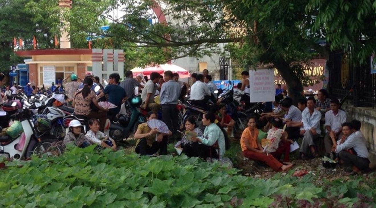 Tại điểm Đại học Hồng Đức 1, phụ huynh ngồi tràn lan trước hai bên cổng trường, có người chui vào lùm cây, có người che chắn bạt để tránh nắng. Trên nét mặt của các phụ huynh đều toát lên sự căng thẳng, lo lắng.