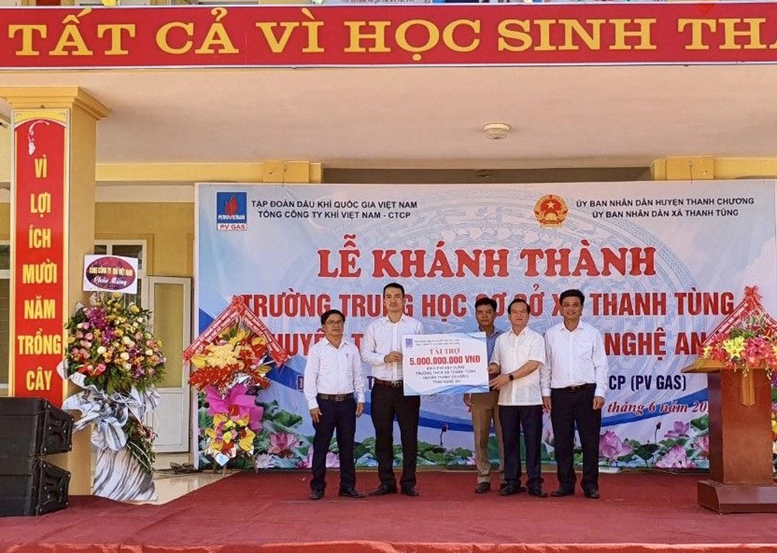 (Thanh tra) - Tổng công ty Khí Việt Nam (PV GAS) vừa phối hợp cùng chính quyền và nhân dân huyện Thanh Chương, tỉnh Nghệ An tổ chức buổi lễ khánh thành bàn giao công trình tài trợ Trường THCS xã Thanh Tùng, huyện Thanh Chương, tỉnh Nghệ An.