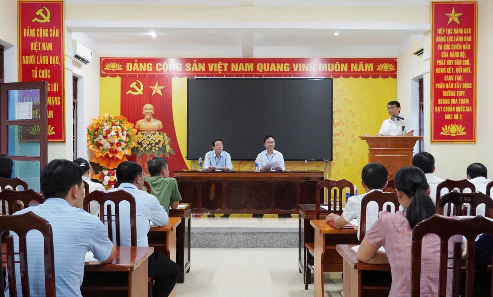 Hiệu trưởng Trường THPT Hoàng Hoa Thám báo cáo hoàn thành công tác chuẩn bị. Ảnh: NH