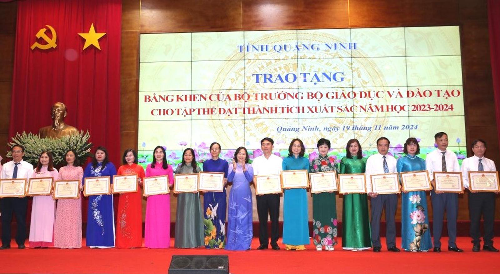 Thay mặt lãnh đạo Bộ GD&ĐT, Phó Chủ tịch Thường trực HĐND tỉnh Quảng Ninh tặng Bằng khen của Bộ GD&ĐT cho các tập thể đạt thành tích xuất sắc năm học 2023 - 2024. Ảnh: TTTT