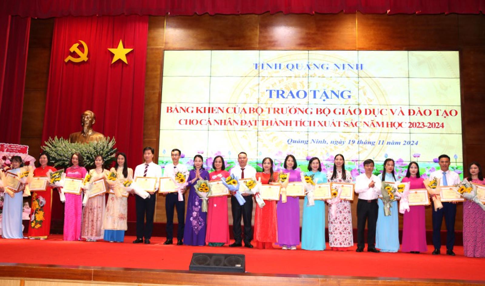 Thay mặt lãnh đạo Bộ GD&ĐT, lãnh đạo Sở GD&ĐT tỉnh Quảng Ninh tặng Bằng khen của Bộ GD&ĐT cho các cá nhân đạt thành tích xuất sắc năm học 2023 - 2024. Ảnh: TTTT