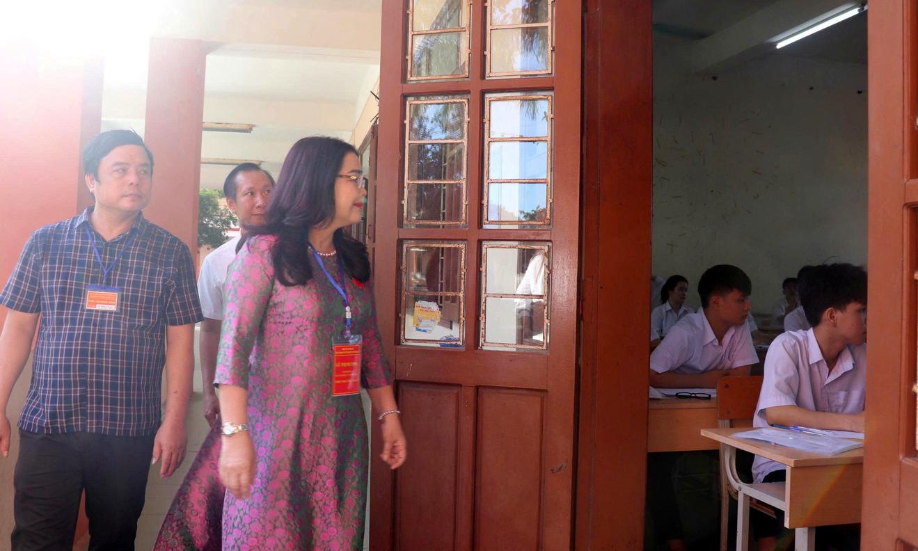 Giám đốc Sở GD&ĐT tỉnh Quảng Trị Lê Thị Hương kiểm tra công tác thi tại điểm trường THPT Chuyên Lê Quý Đôn. Ảnh: Minh Tân