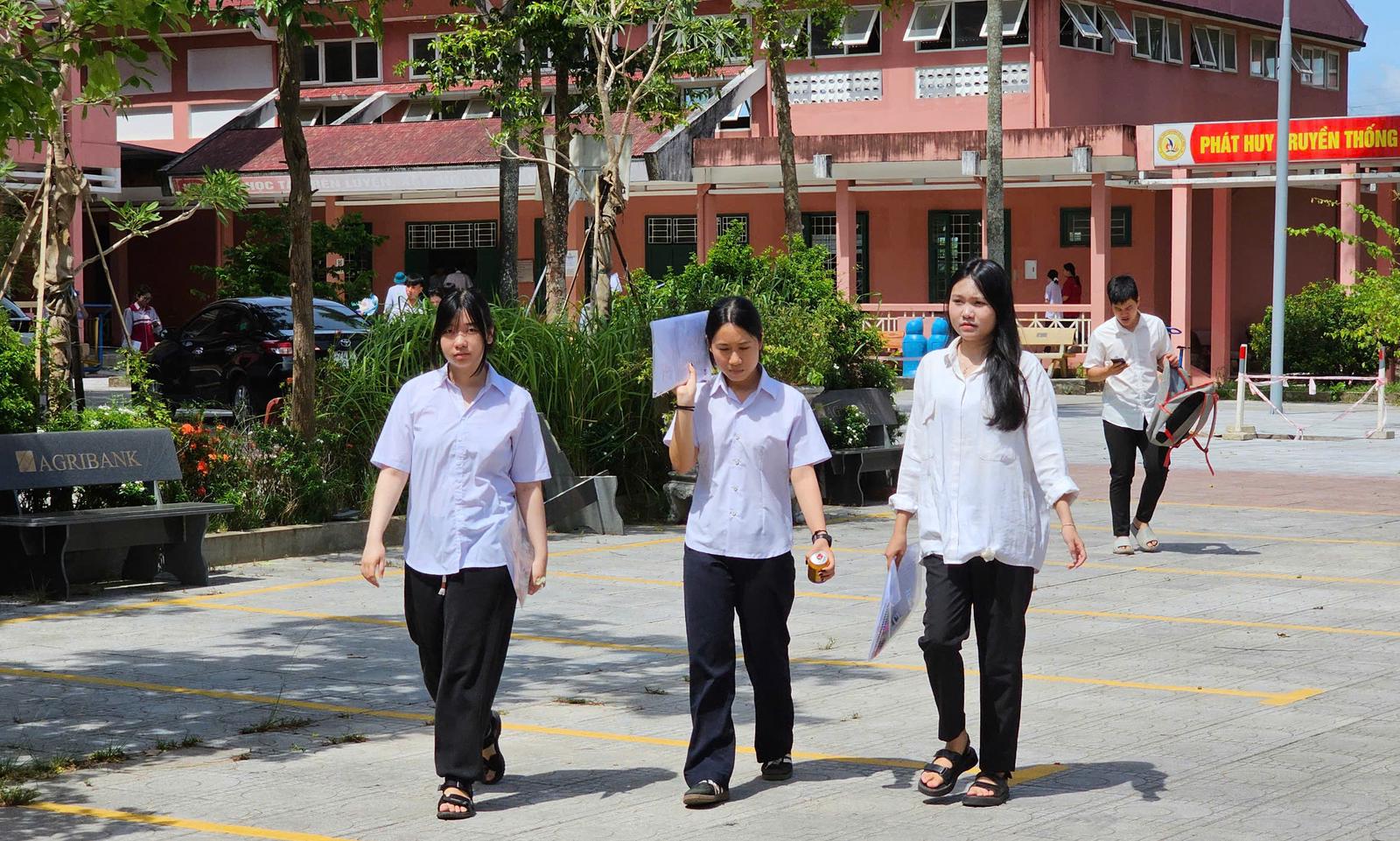 Các thí sinh hoàn tất môn thi Ngữ văn tại điểm thi THPT Chuyên Lê Quý Đôn. Ảnh: Minh Tân