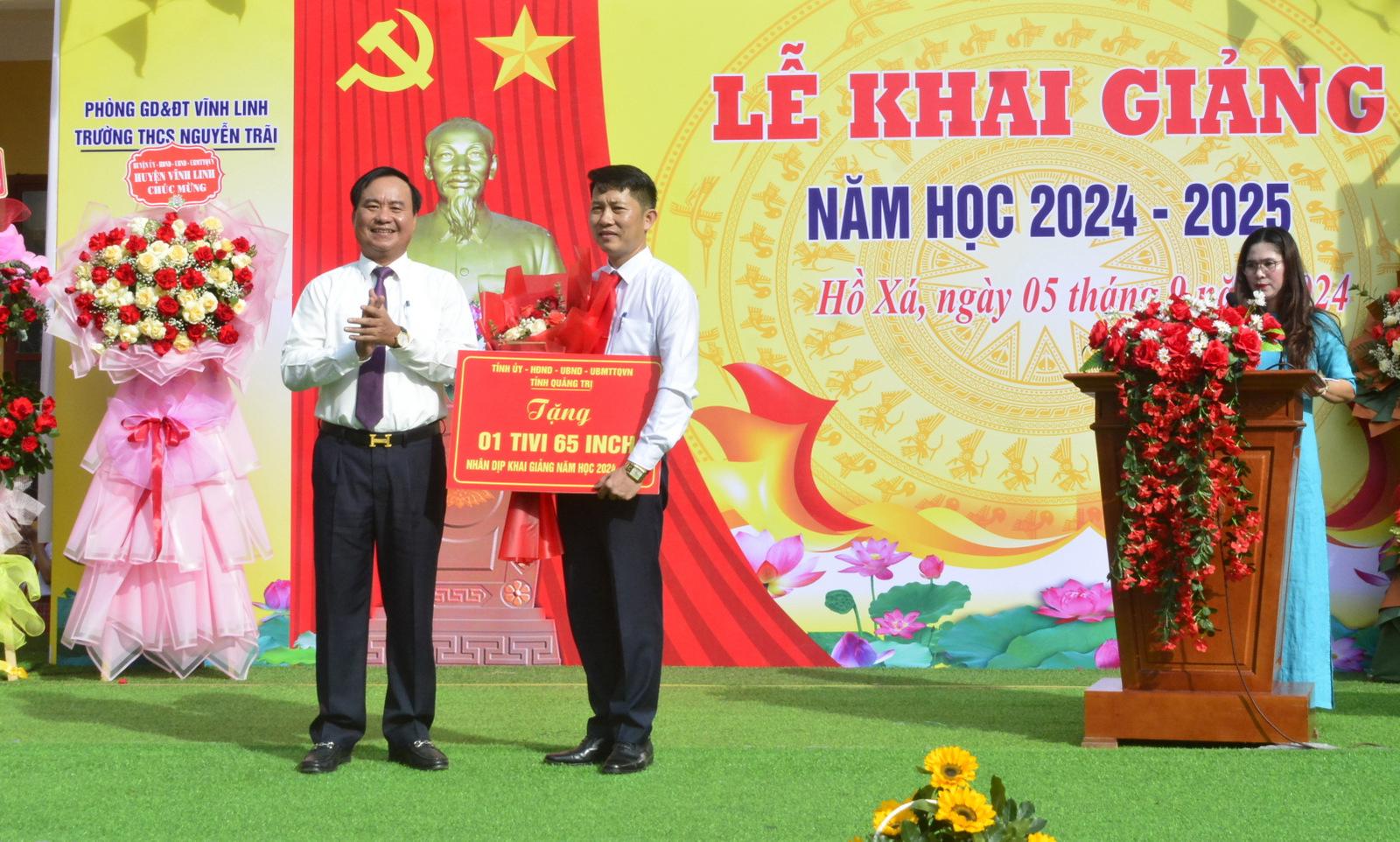 Chủ tịch UBND tỉnh Quảng Trị Võ Văn Hưng tặng quà cho thầy và trò Trường THCS Nguyễn Trãi trong năm học mới 2024 - 2025. Ảnh: Minh Tân