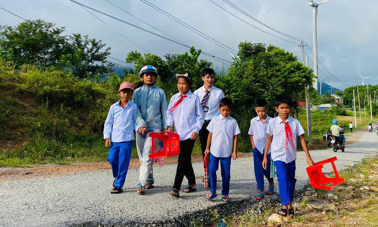 Phụ huynh, giáo viên đồng hành cùng các học sinh ở huyện miền núi Hướng Hóa trước thềm năm học mới 2024 - 2025. Ảnh: Minh Tân