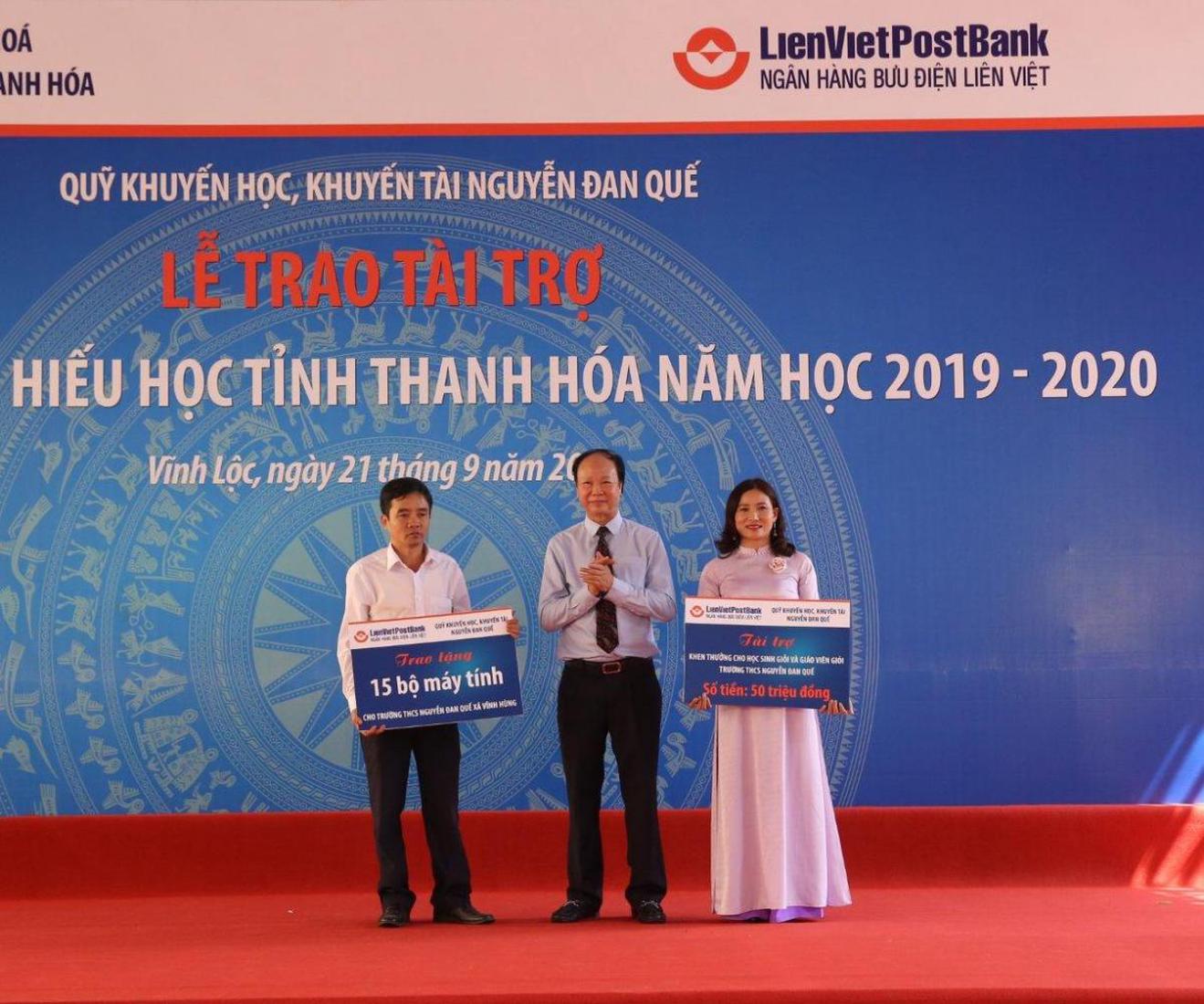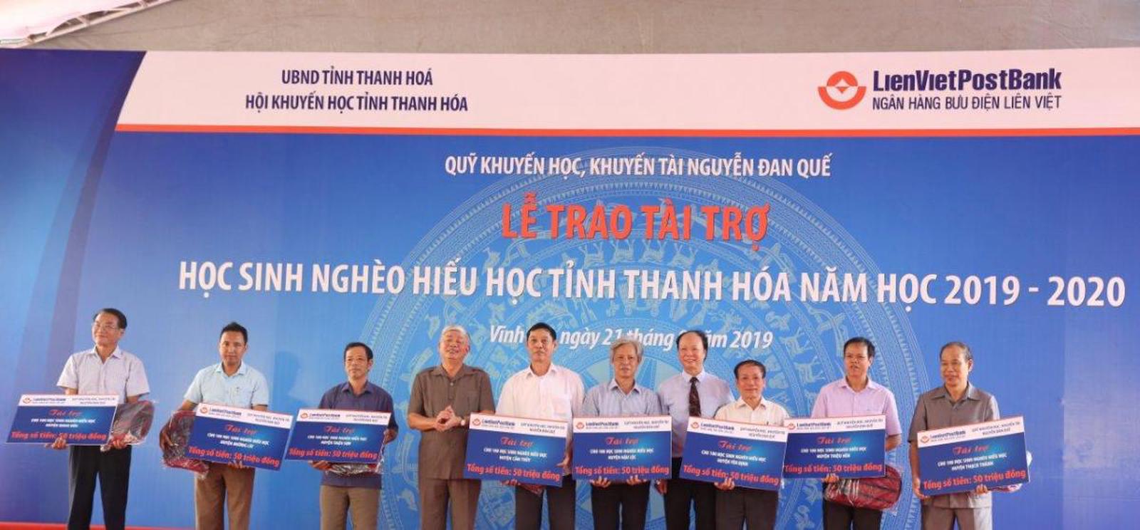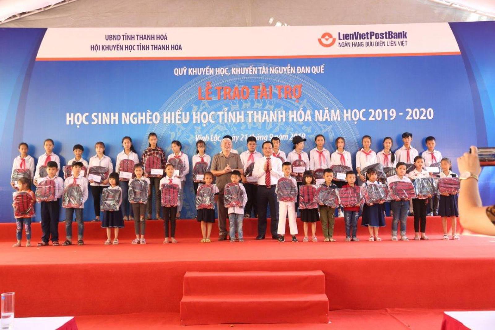 (Thanh tra) - Ngân hàng TMCP Bưu điện Liên Việt phối hợp với Hội Khuyến học tỉnh Thanh Hóa và Trường THCS Nguyễn Đan Quế vừa tổ chức lễ trao học bổng và đồ dùng học tập từ Quỹ Khuyến học, khuyến tài (KHKT) Nguyễn Đan Quế cho học sinh nghèo hiếu học trên địa bàn tỉnh năm học 2019-2020.