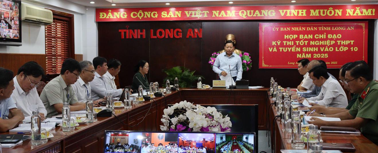 (Thanh tra) - Ngày 27/5, UBND tỉnh Long An tổ chức cuộc họp Ban Chỉ đạo Kỳ thi tốt nghiệp THPT và tuyển sinh lớp 10 năm 2025 theo hình thức trực tuyến đến các điểm cầu huyện, thị xã, thành phố. Phó Chủ tịch UBND tỉnh Phạm Tấn Hòa – Trưởng Ban Chỉ đạo – chủ trì cuộc họp nhằm đánh giá tình hình chuẩn bị và chỉ đạo các nội dung trọng tâm cho hai kỳ thi sắp tới.