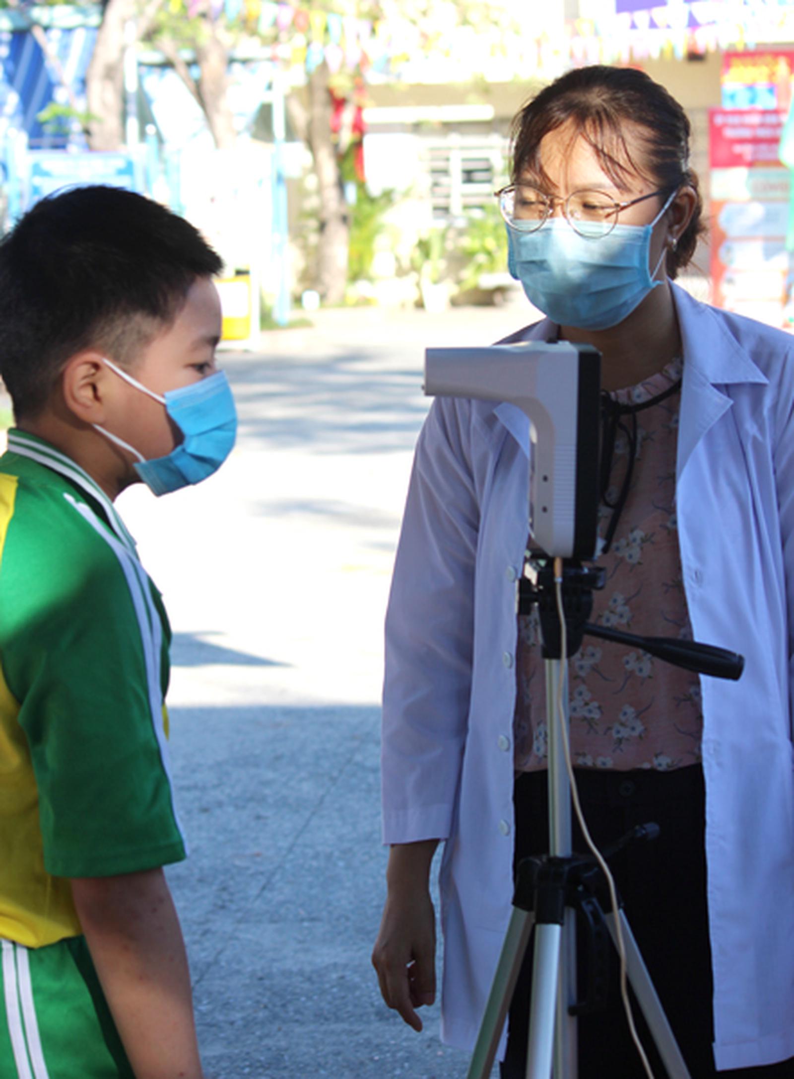 Ngay từ cổng trường các em học sinh, thầy, cô giáo đều được đo thân nhiệt và rửa tay bằng dung dịch sát khuẩn để đảm bảo phòng dịch Covid-19. Có trường còn trang bị khẩu trang y tế để học sinh thay mới trước khi vào lớp.