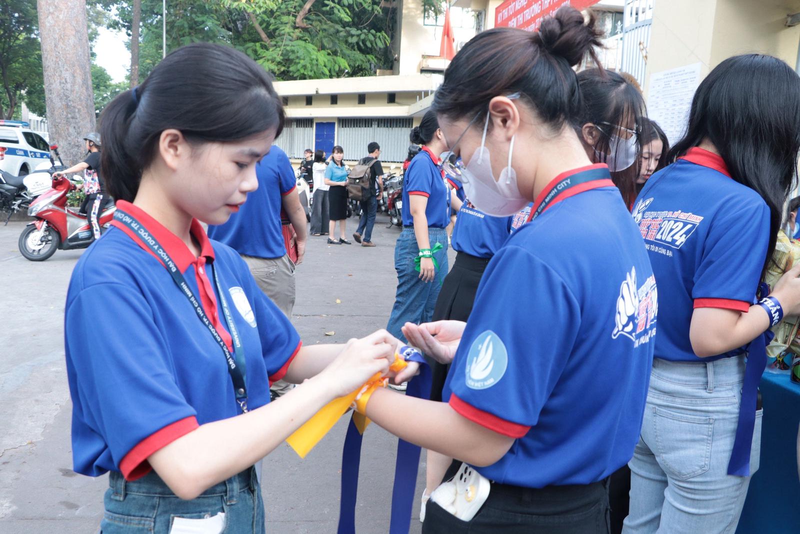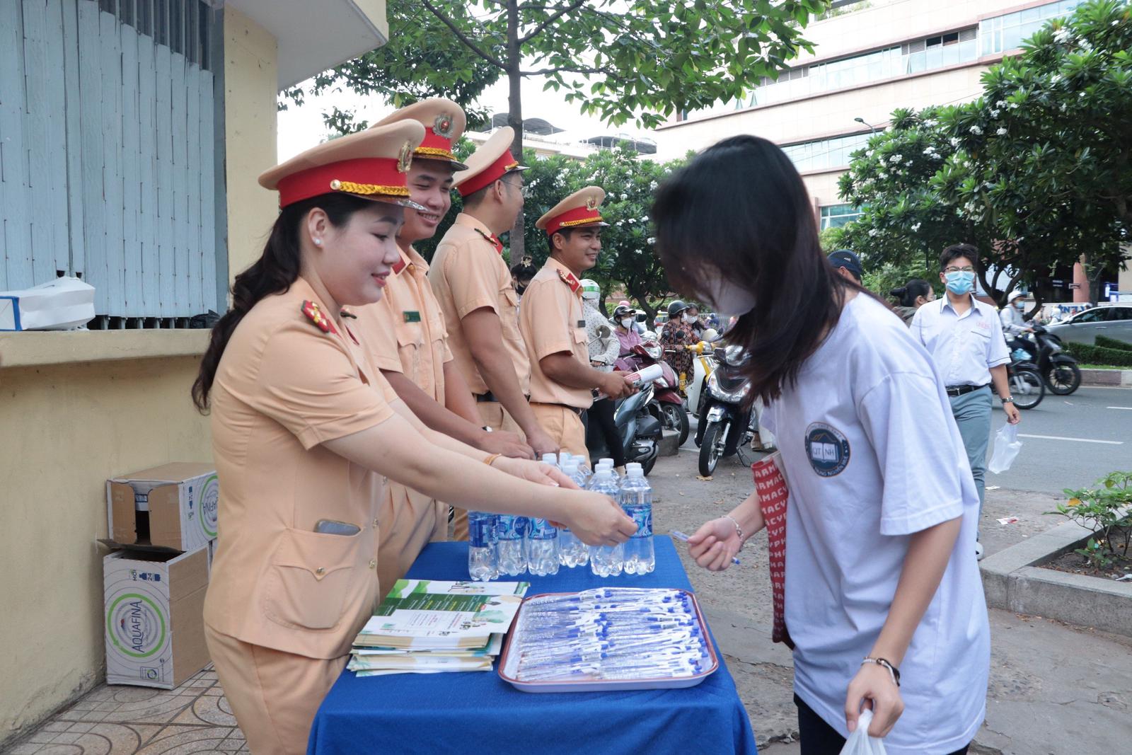 Tại các điểm thi, lực lượng công an, CSGT... cũng túc trực để làm nhiệm vụ đảm bảo an ninh trật tự, phân luồng giao thông, phát tờ rơi tuyên truyền, nước suối hỗ trợ sĩ tử và phụ huynh.