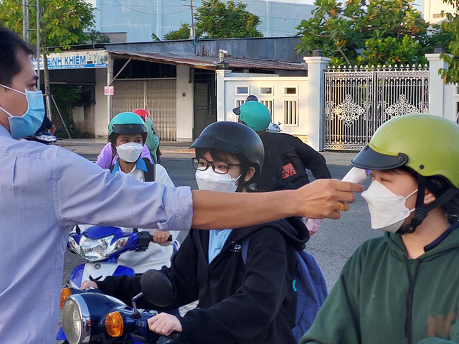 Đo thân nhiệt cho học sinh khi đến trường để đảm bảo an toàn phòng, chống dịch Covid-19. Ảnh: XC