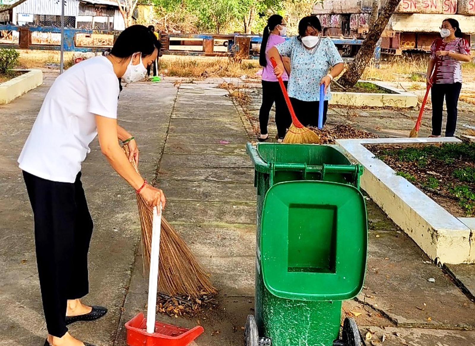 Vệ sinh trường lớp trước khi học sinh đi học trực tiếp trở lại. Ảnh: XC