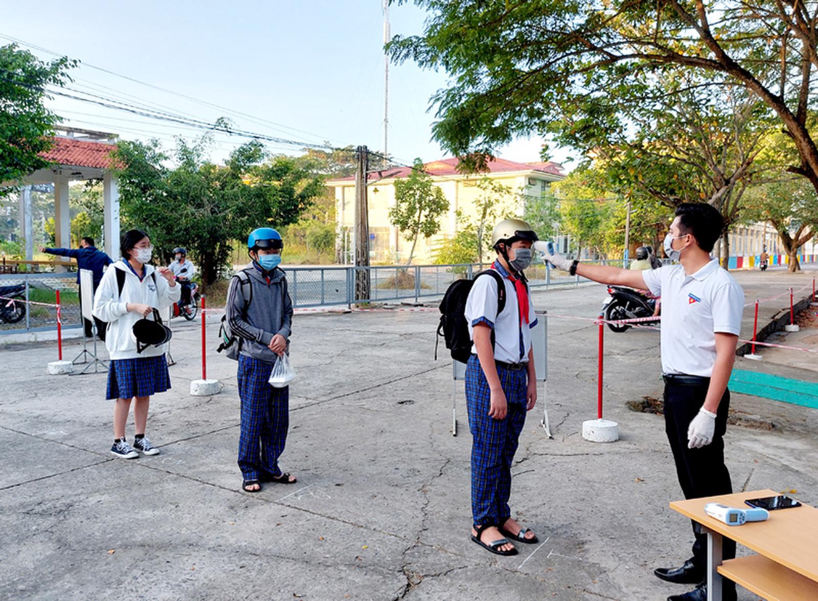 Đo thân nhiệt cho học sinh đến trường học trực tiếp. Ảnh: XC