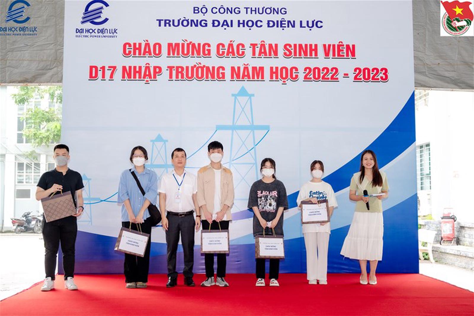 TS. Trường Nam Hưng - Phó Hiệu trưởng Trường Đại học Điện lực trao quà cho 5 tân sinh viên khóa D17 đầu tiên đến nhập học. Ảnh: ĐHĐL