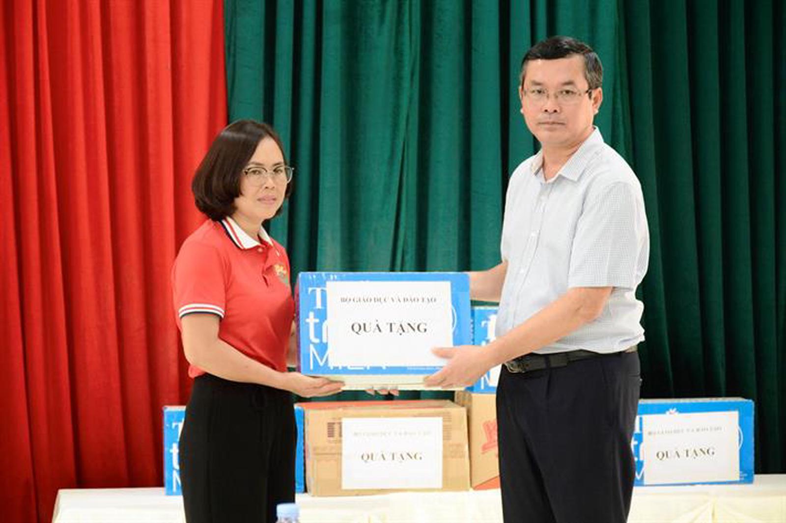 Thứ trưởng Bộ GDĐT Nguyễn Văn Phúc trao hỗ trợ cho các trường học tại huyện Hạ Hòa. Ảnh: TT
