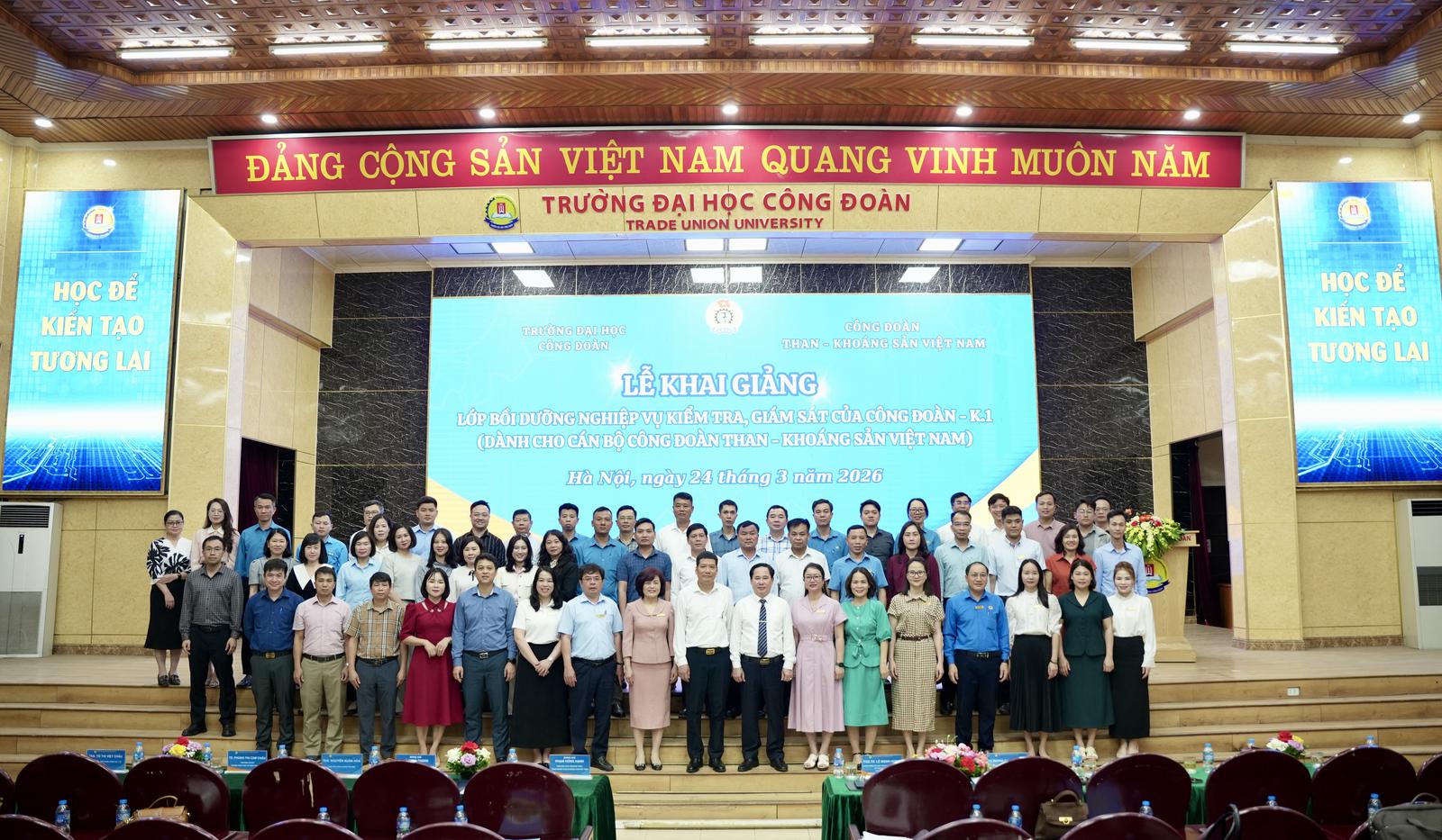 Sáng 24/3, Trường Đại học Công đoàn đã tổ chức Lễ khai giảng lớp Bồi dưỡng Nghiệp vụ kiểm tra, giám sát của công đoàn - khóa 1, với sự tham dự của đại diện lãnh đạo Công đoàn Than - Khoáng sản Việt Nam, lãnh đạo nhà trường, giảng viên và 65 học viên là cán bộ công đoàn đến từ các đơn vị trong ngành.
