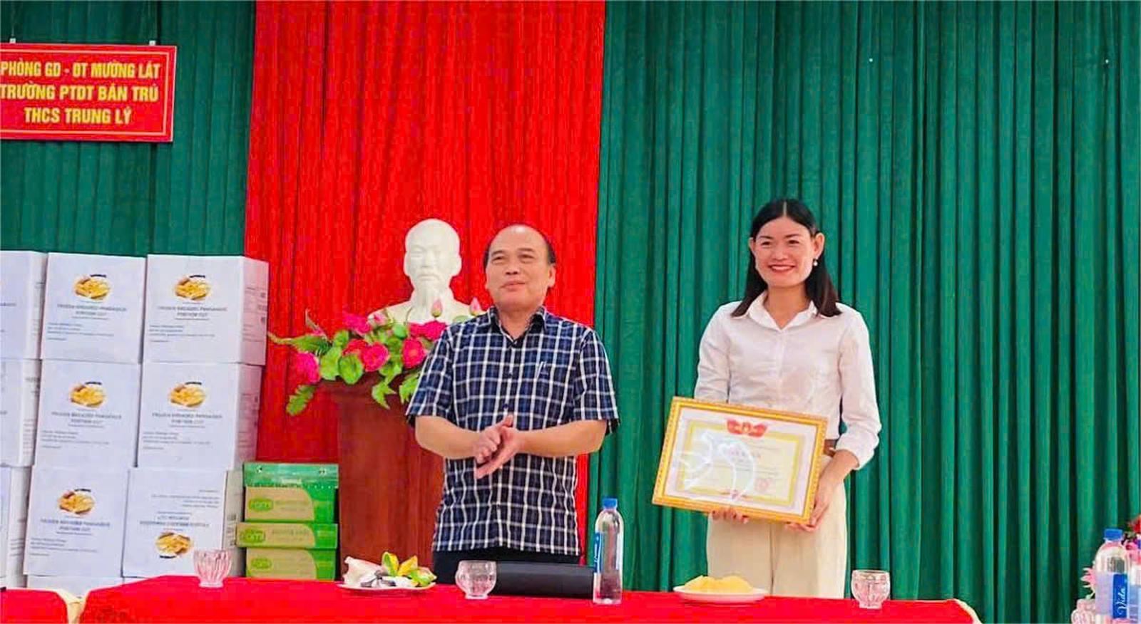Chiều 27/9, thầy Nguyễn Duy Thủy, Hiệu trưởng Trường PTDT bán trú THCS Trung Lý, xã Trung Lý, huyện vùng cao Mường Lát cho biết: Phó Giám đốc Sở GD&ĐT Thanh Hóa Nguyễn Văn Dĩnh vừa trao giấy khen, phần thưởng cho cô giáo Bùi Thị Châm, giáo viên của trường, vì có thành tích xuất sắc trong những ngày mưa lũ vừa qua.