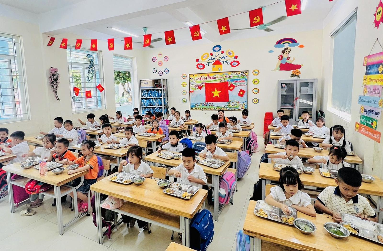 Giờ ăn trưa của học sinh lớp bán trú tại Trường Tiểu học Hoằng Thanh, xã Hoằng Thanh, tỉnh Thanh Hoá. Ảnh: Hương Trà