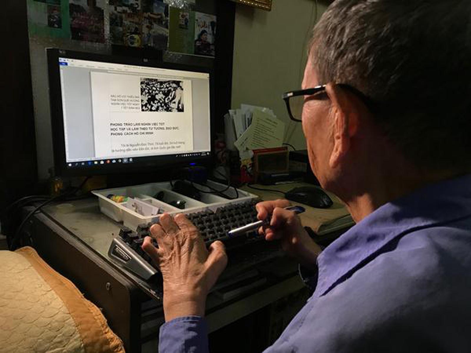 Đã 80 tuổi đời và bị tàn tật, nhưng thầy vẫn hăng say lao động. (Trong ảnh là thầy dùng bút để gõ chữ trên bàn phím). Ảnh: Nam Dũng