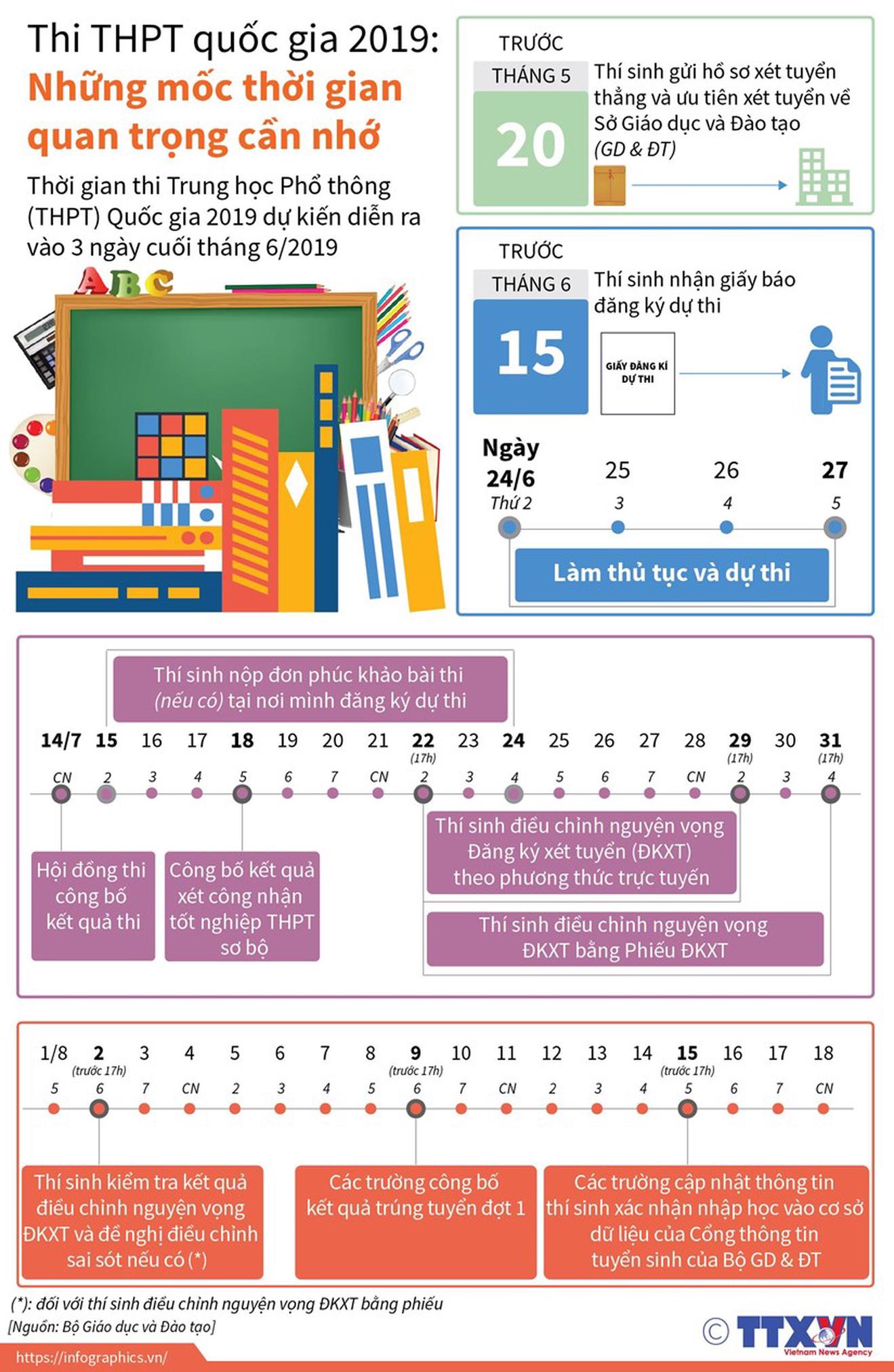 Kỳ thi Trung học Phổ thông Quốc gia 2019 dự kiến diễn ra vào 3 ngày cuối tháng Sáu với 3 bài thi độc lập gồm Toán, Ngữ văn, Ngoại ngữ và 2 bài thi tổ hợp./.