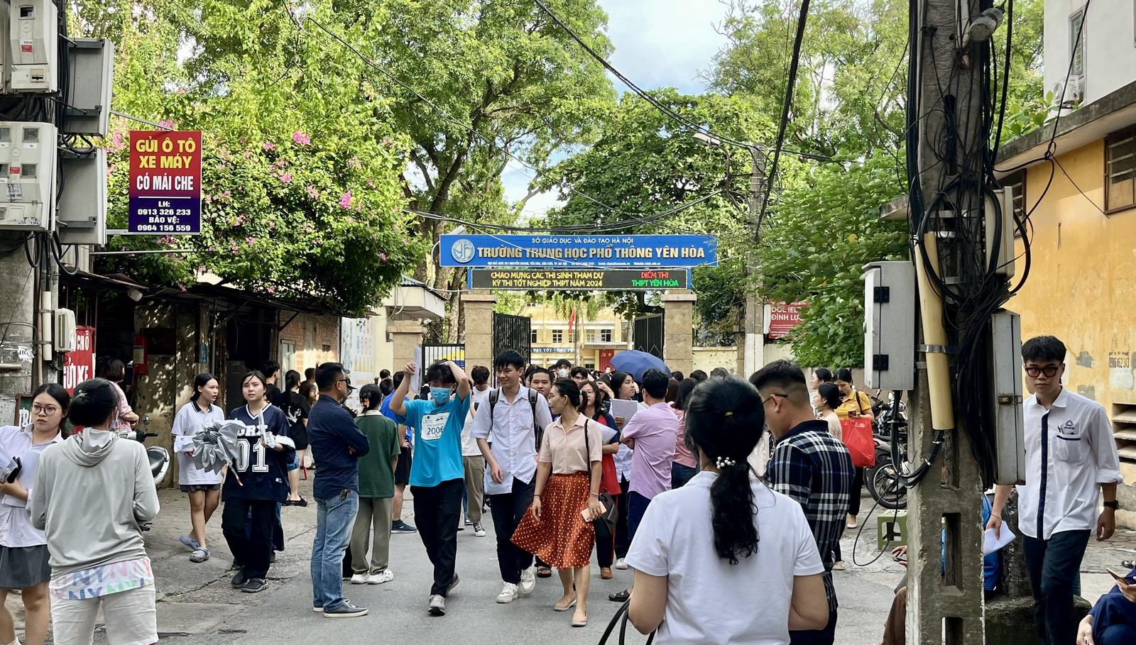 Các thí sinh tại điểm thi Trường THPT Yên Hoà trong buổi thi Toán chiều nay. Ảnh: Gia Linh