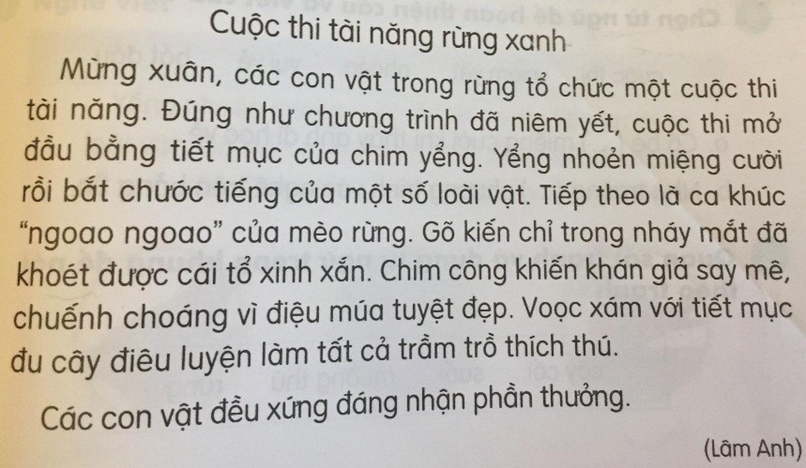 Ở bài đọc “ Cuộc thi tài năng rừng xanh” nói trên cũng dày đặc những từ ngữ khó như: “Ca khúc ngoao ngoao của mèo rừng”; “chim công khiến khán giá say mê, chuếnh choáng”; “voọc xám với tiết mục đu cây “điêu luyện” trầm trồ”...