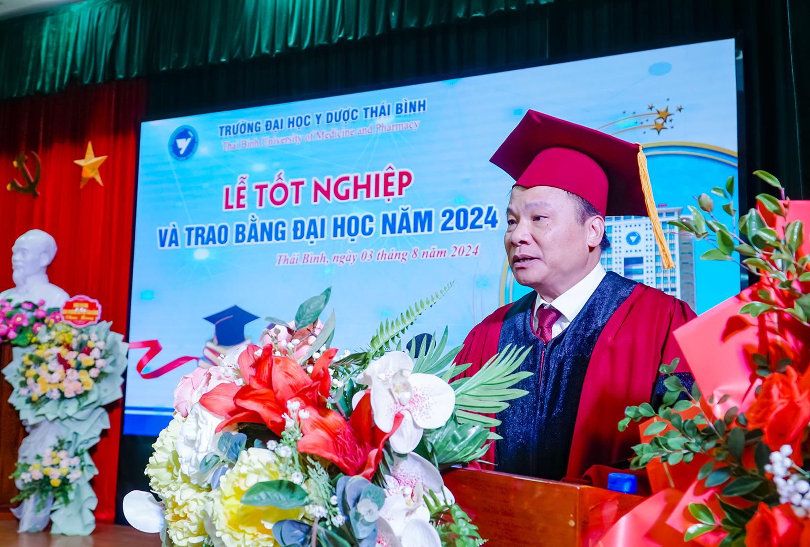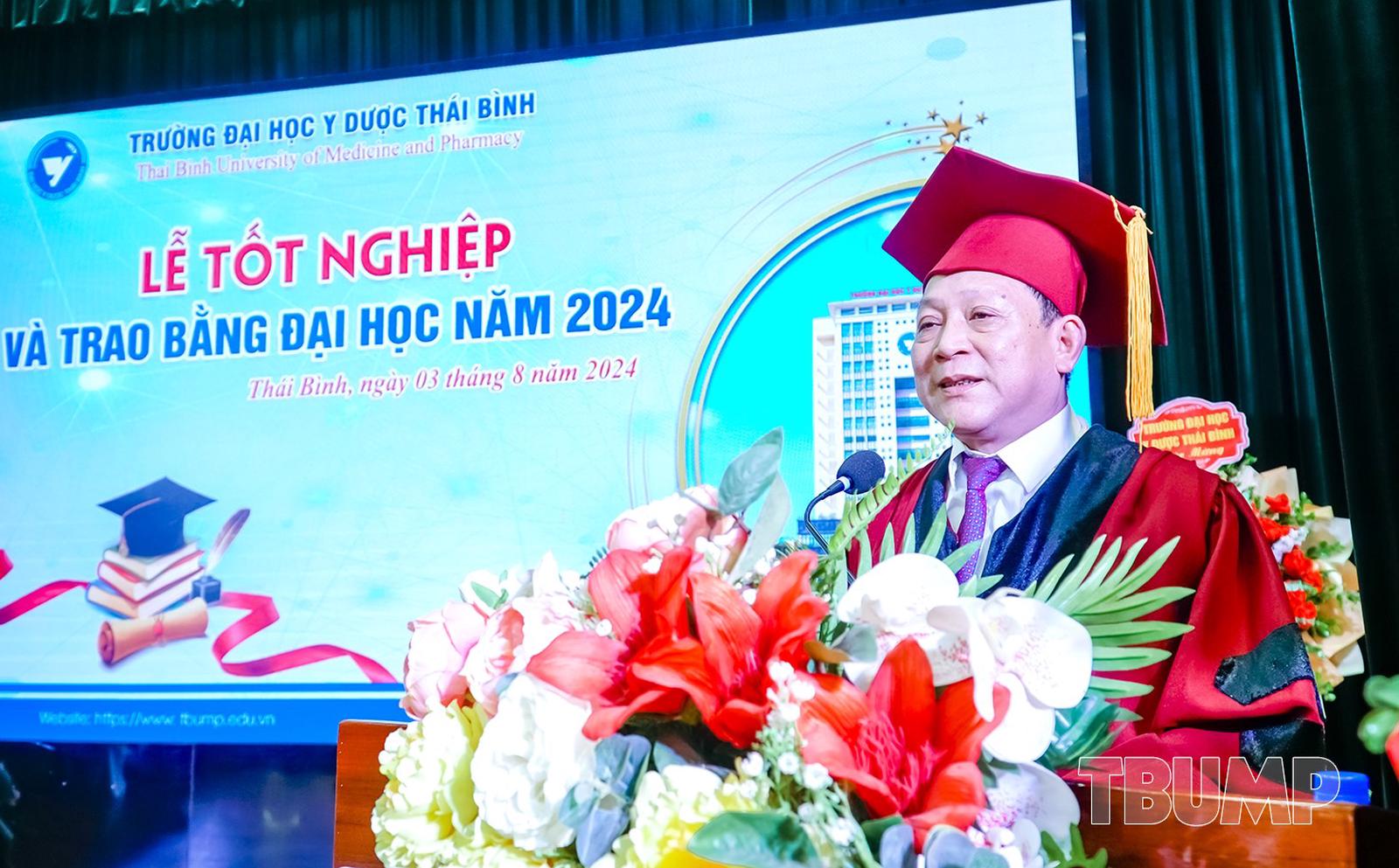 Chúc mừng và chào đón 943 tân bác sĩ, tân dược sĩ, tân cử nhân được trao bằng tốt nghiệp, Thứ trưởng Bộ Y tế Nguyễn Tri Thức biểu dương, ghi nhận những kết quả mà thầy và trò Trường Đại học Y Dược Thái Bình đã đạt được trong suốt chiều dài 56 năm xây dựng và phát triển.