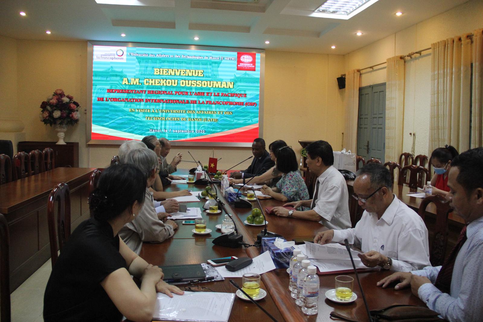 TS.Chekou Oussouman bày tỏ sự vui mừng và cảm ơn lãnh đạo nhà trường đã có buổi đón tiếp thân tình dành cho đoàn. Đồng thời, ông cũng chia sẻ thêm về những kỷ niệm tốt đẹp của mình đối với đất nước và con người Việt Nam. Ông luôn coi Việt Nam là quê hương thứ hai của mình. Khi nhận được lời mời của Phó Hiệu trưởng Trần Đức Minh về việc đến thăm và trao đổi những kế hoạch hợp tác đào tạo cán bộ kinh tế, kỹ thuật trong thời đại Cách mạng công nghiệp 4.0, ông đã nhận lời ngay. Ông cho rằng, 4 lĩnh vực đào tạo của nhà trường hiện nay (Kinh tế - Quản trị Kinh doanh, Công nghệ - Kỹ thuật, Ngôn ngữ, Sức khỏe) là rất phù hợp với những hoạt động của Cộng đồng Pháp ngữ, đặc biệt là Kinh tế và Công nghệ - Kỹ thuật. Ông mong muốn Trường ĐH Kinh doanh và Công nghệ Hà Nội và OIF tại Việt Nam sẽ đề ra những phương hướng hợp tác đào tạo cụ thể, hiệu quả, từng bước gặt hái thành công trong thời gian sắp tới.