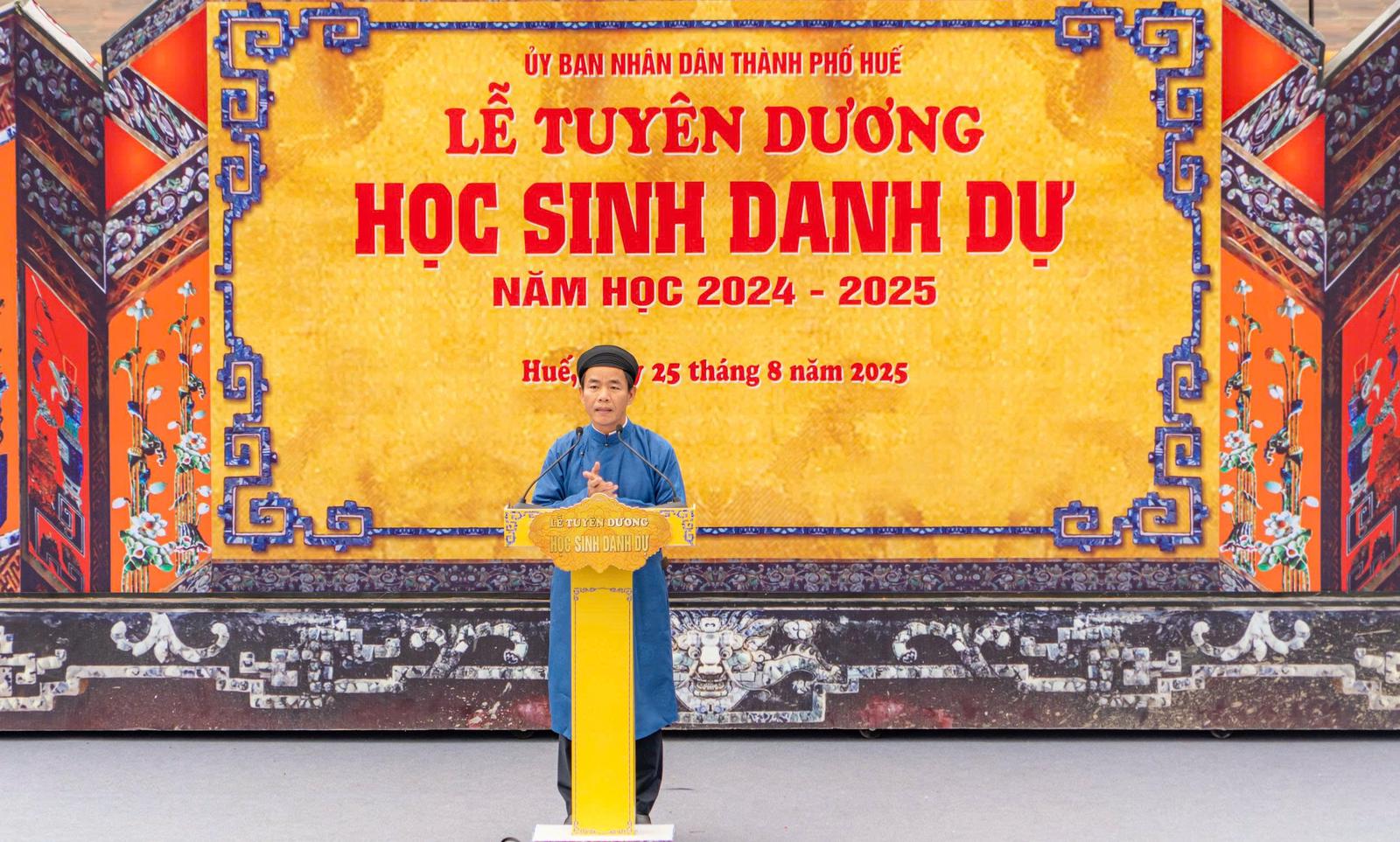 Phát biểu tại chương trình, Chủ tịch UBND TP Huế Nguyễn Văn Phương gửi lời chúc mừng đến các em học sinh được tuyên dương, đồng thời khẳng định Huế luôn xem giáo dục là nhiệm vụ trọng tâm. Thành phố đã đạt nhiều kết quả nổi bật: 85/108 học sinh đạt giải học sinh giỏi quốc gia, 4 huy chương Olympic châu Á và quốc tế, cùng nhiều giải thưởng về khoa học kỹ thuật, ngoại ngữ, khởi nghiệp sáng tạo.