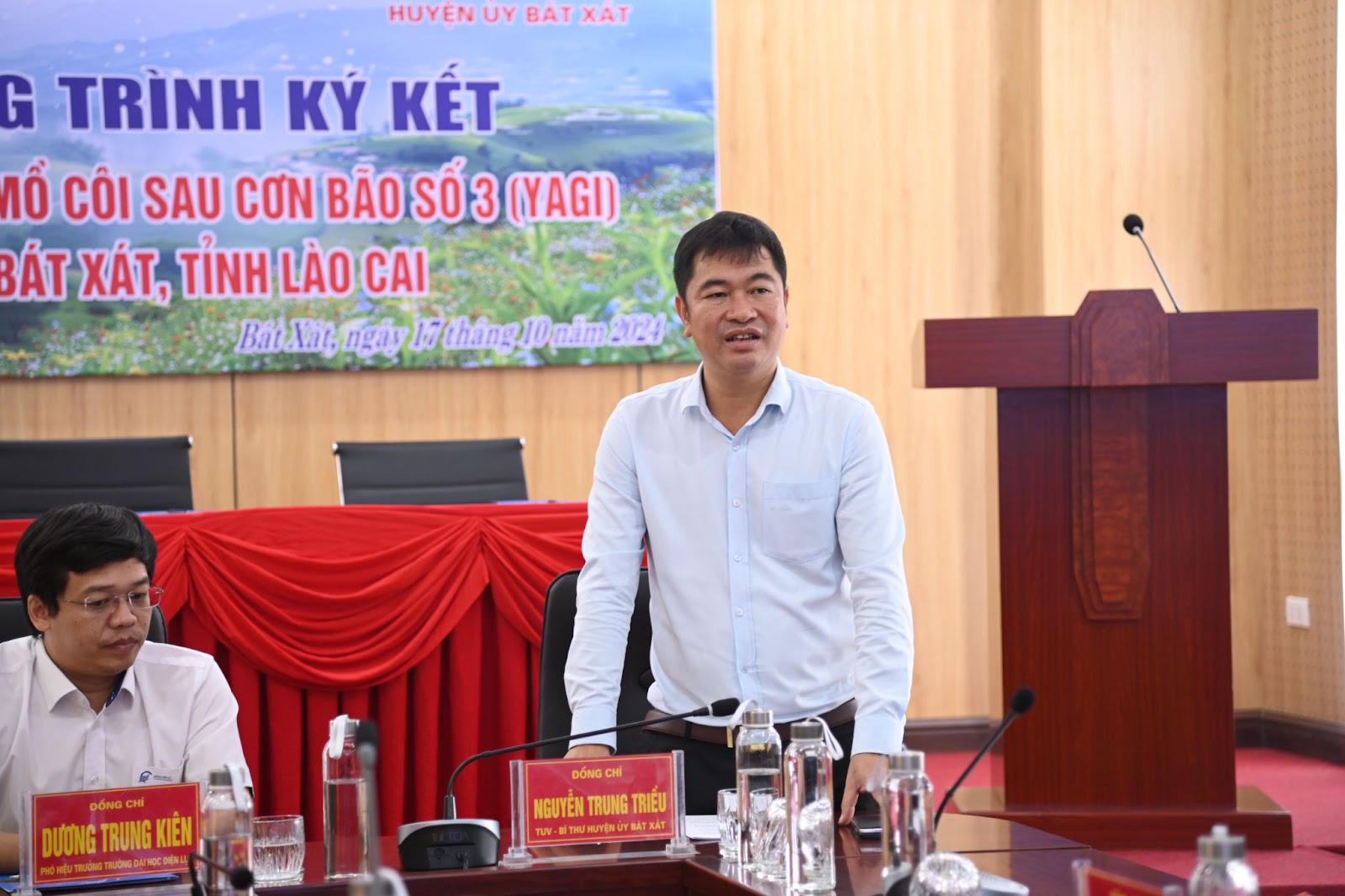 Bí thư Huyện ủy Bát Xát Nguyễn Trung Triều bày tỏ cảm ơn tới TS. Dương Trung Kiên cùng Đoàn Công tác Trường Đại học Điện lực đã tới tận nơi động viên và ký kết hỗ trợ giúp đỡ em Thào Thị Nhè.