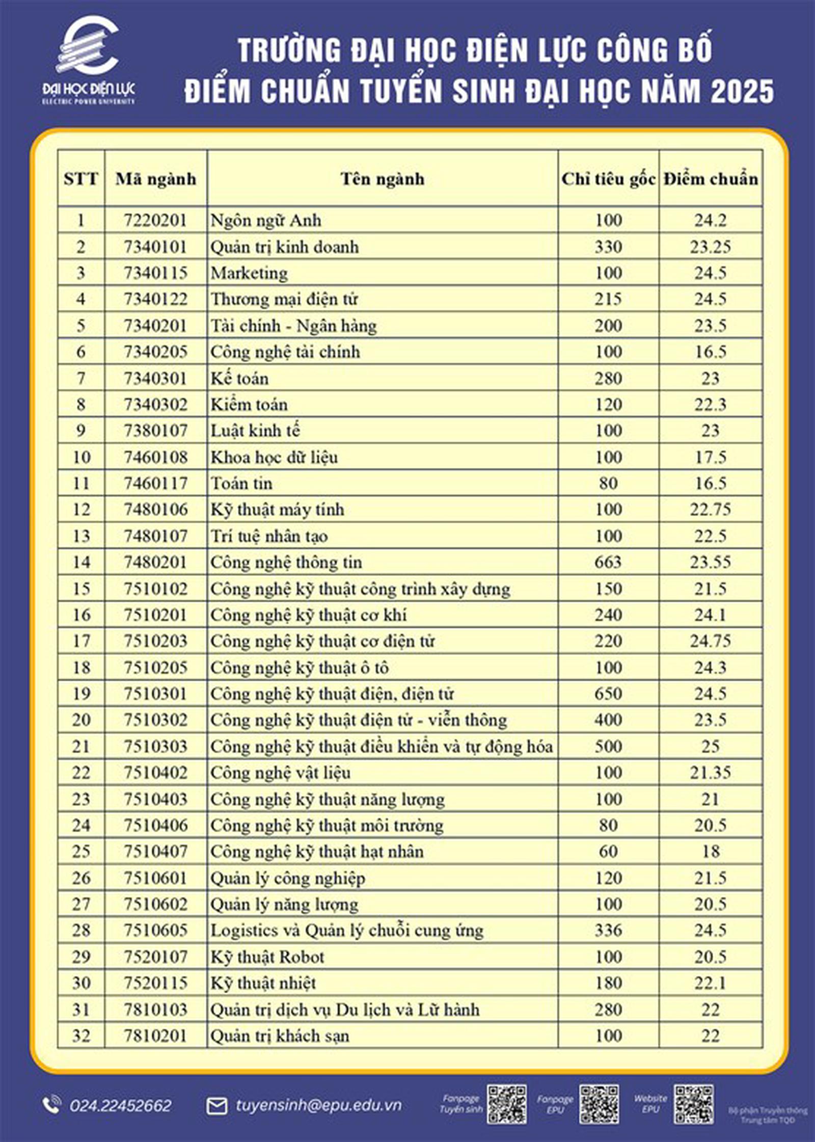 Điểm chuẩn Trường Đại học Điện lực năm 2025. Ảnh: ĐHĐL