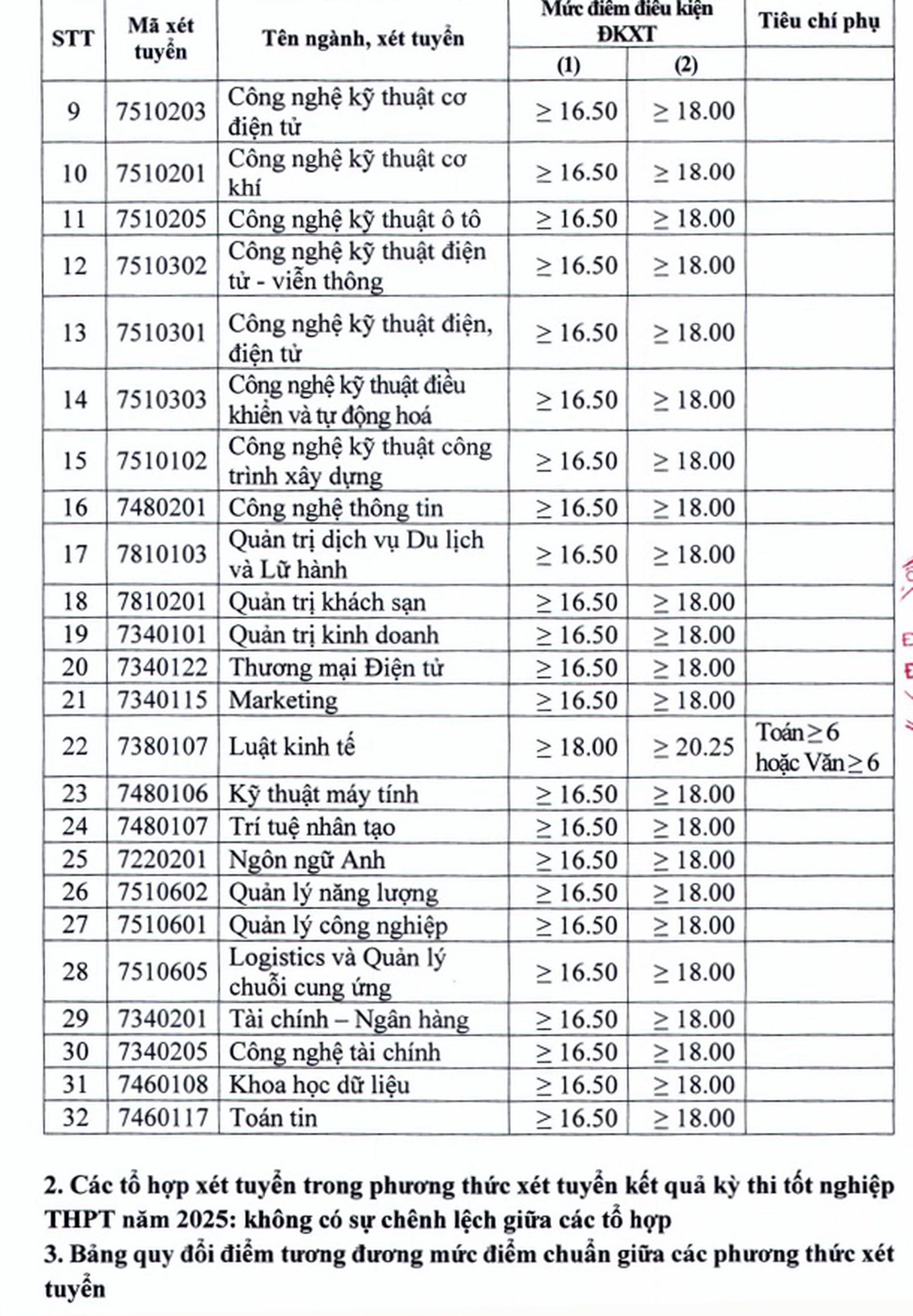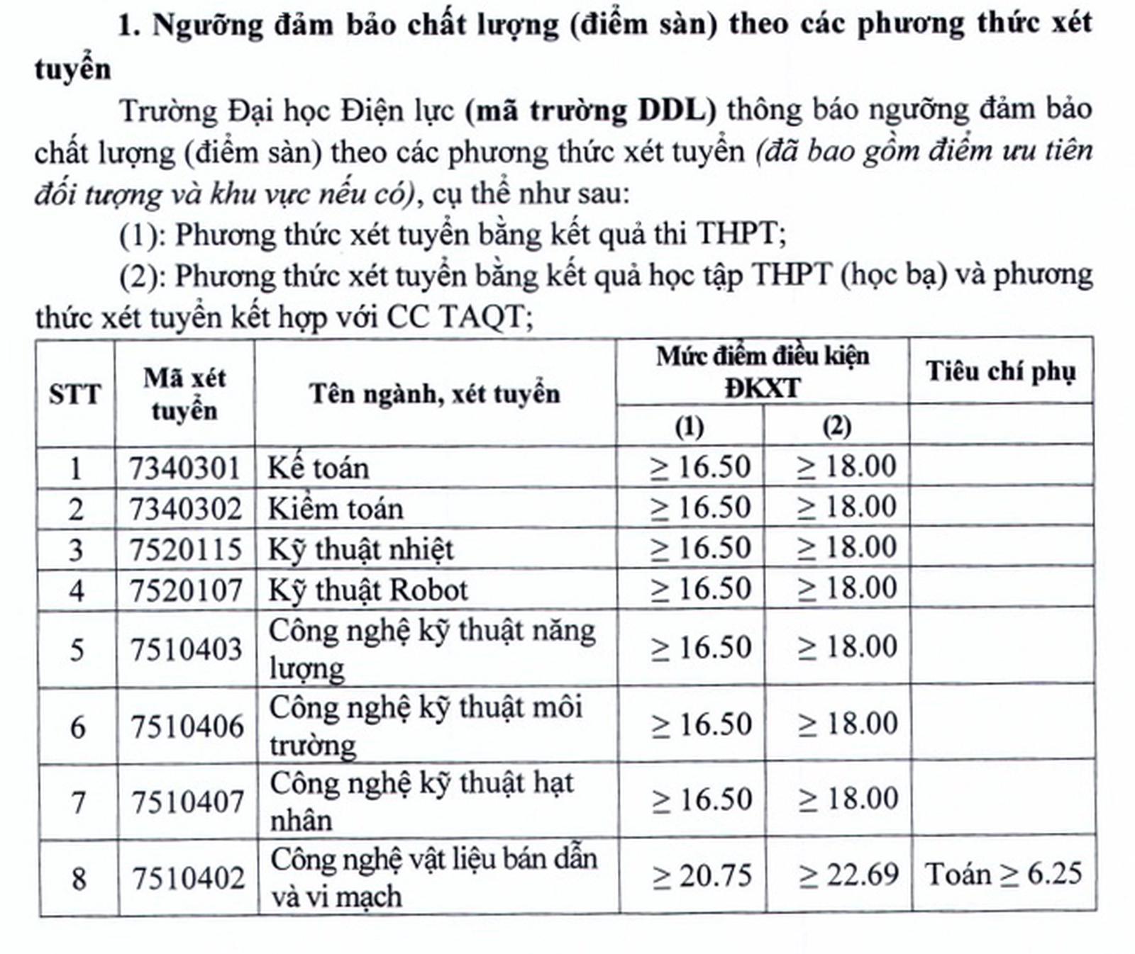 (Thanh tra) - Trường Đại học Điện lực (mã trường DDL) vừa chính thức phát đi thông báo về ngưỡng đảm bảo chất lượng đầu vào (điểm sàn) và bảng quy đổi tương đương mức điểm chuẩn giữa các phương thức xét tuyển cho năm 2025.