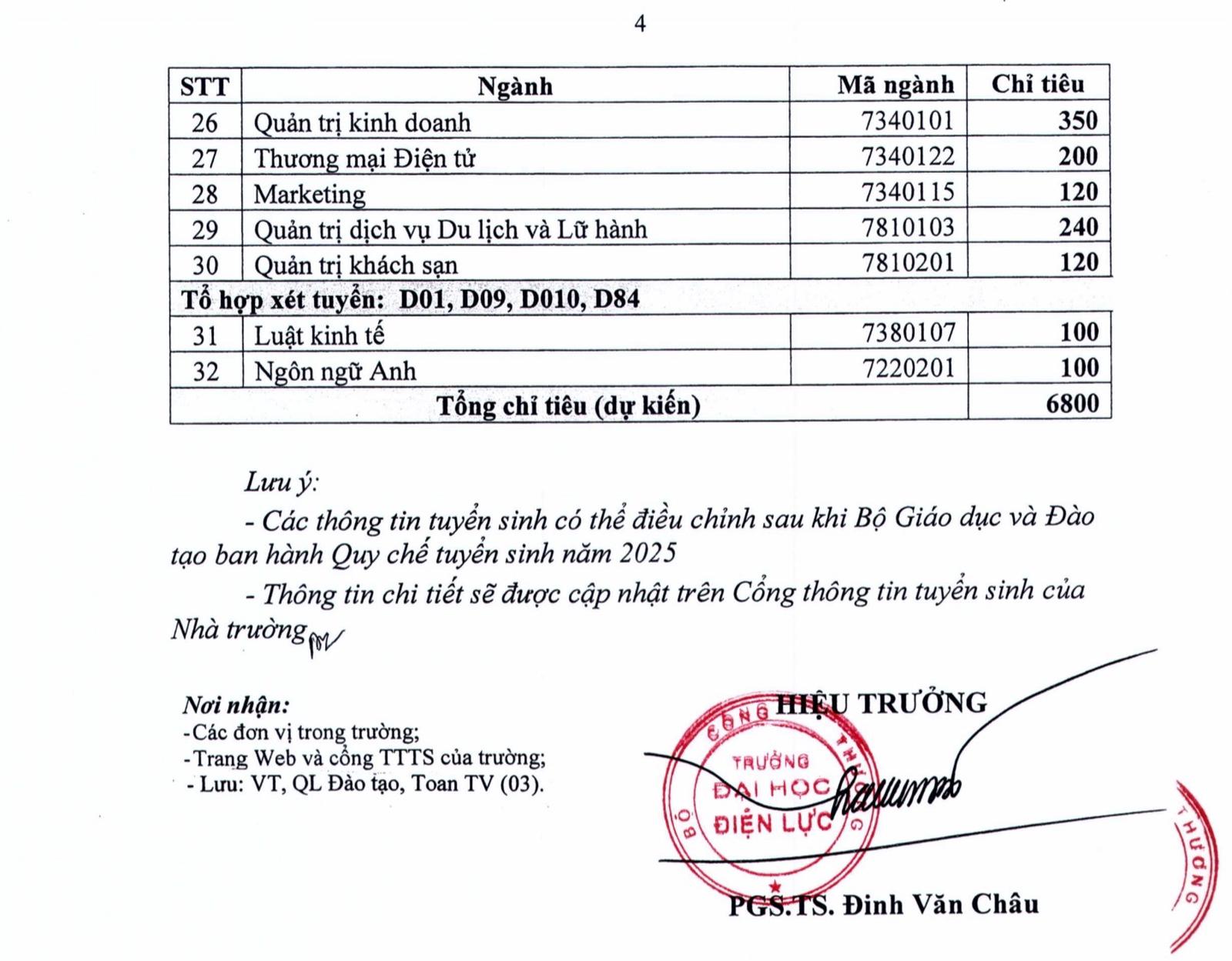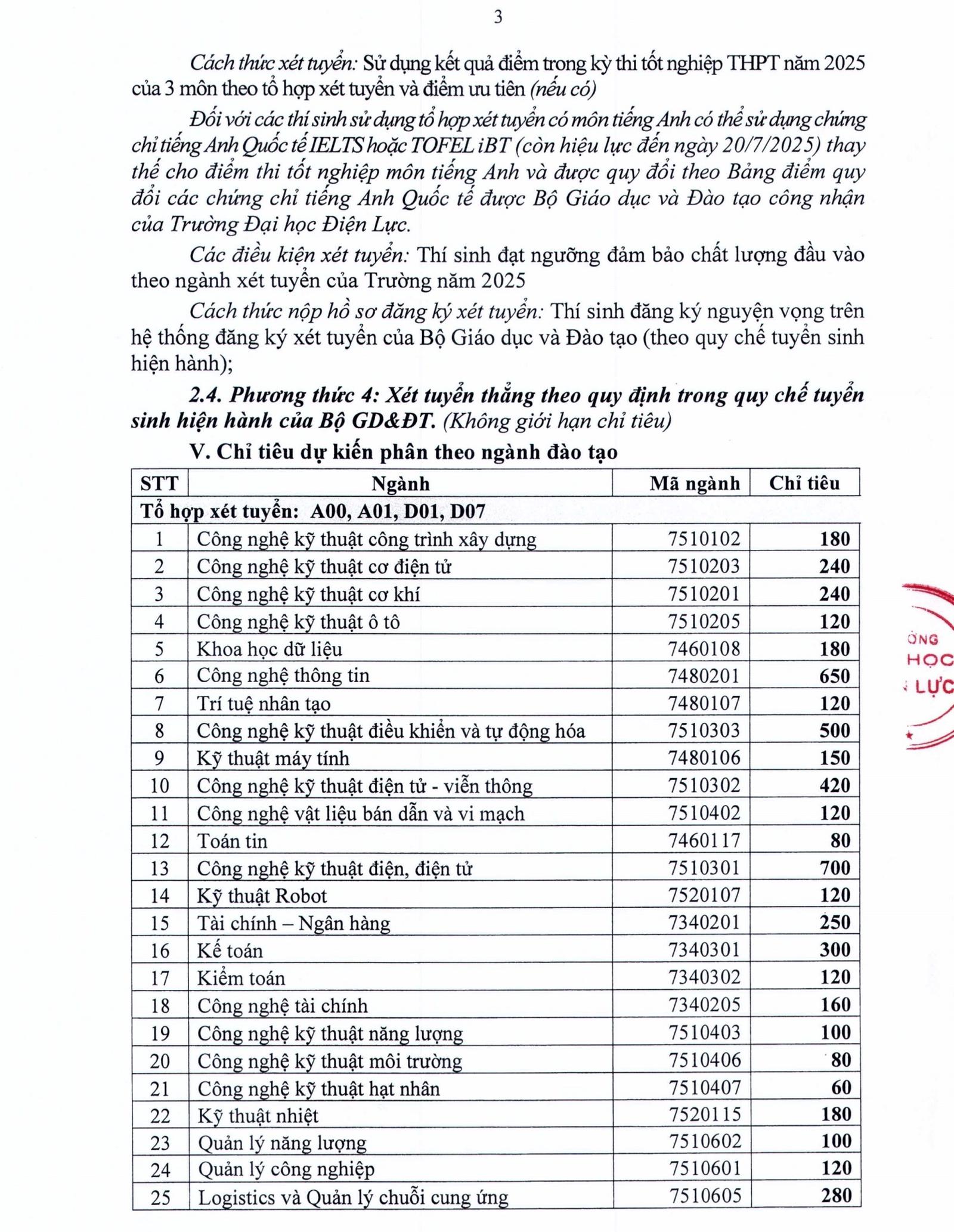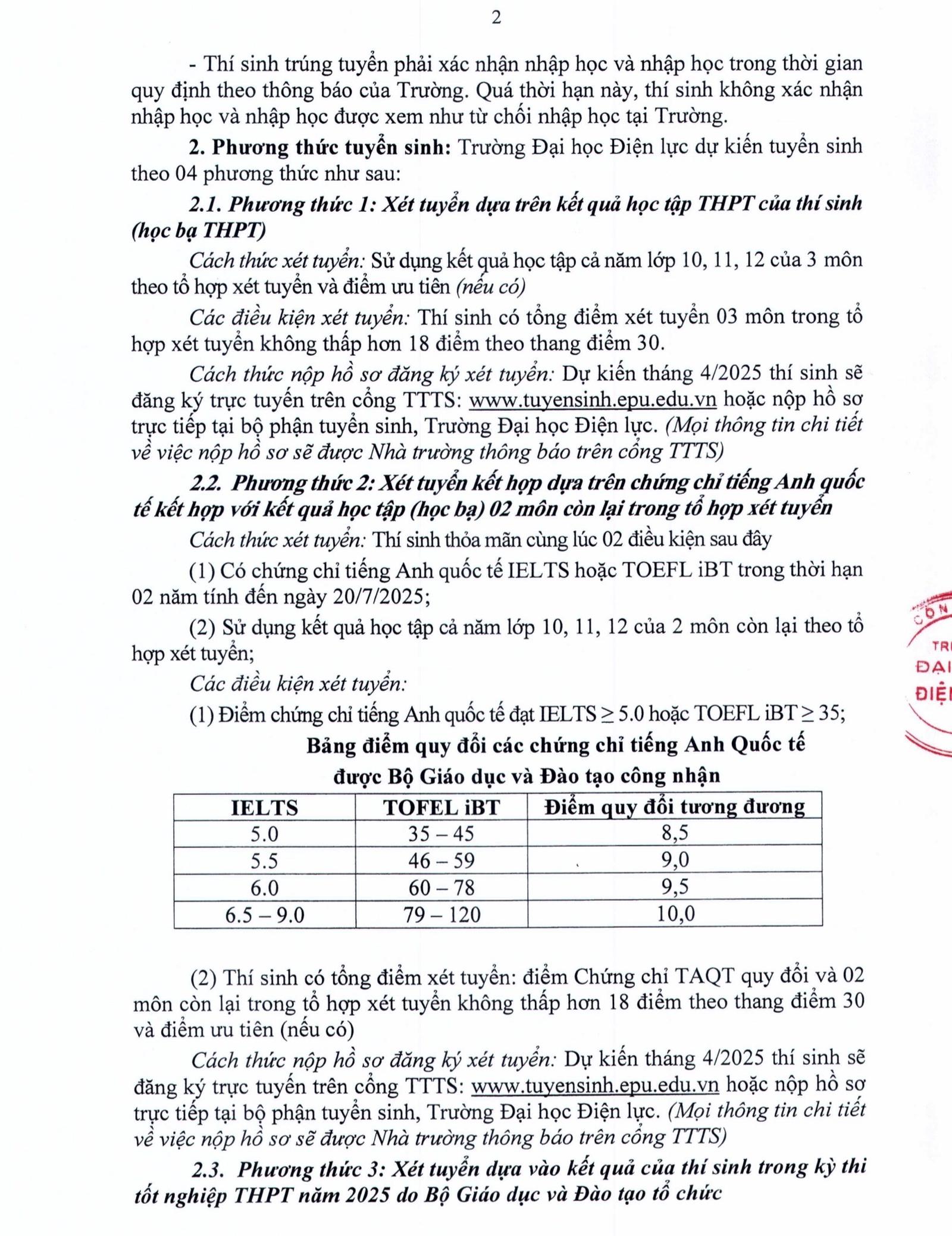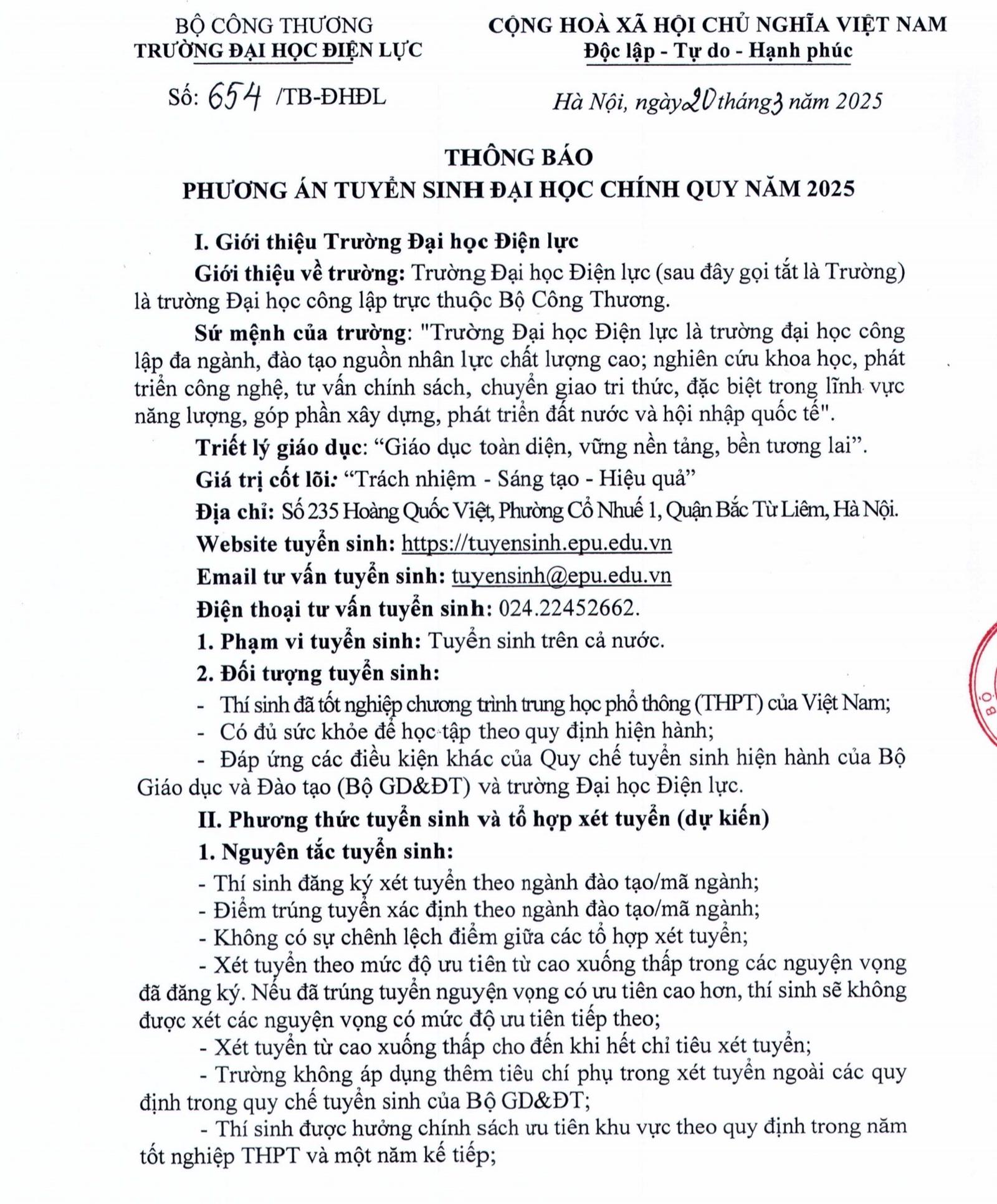 Phương án tuyển sinh đại học chính quy năm 2025 của Trường Đại học Điện lực.