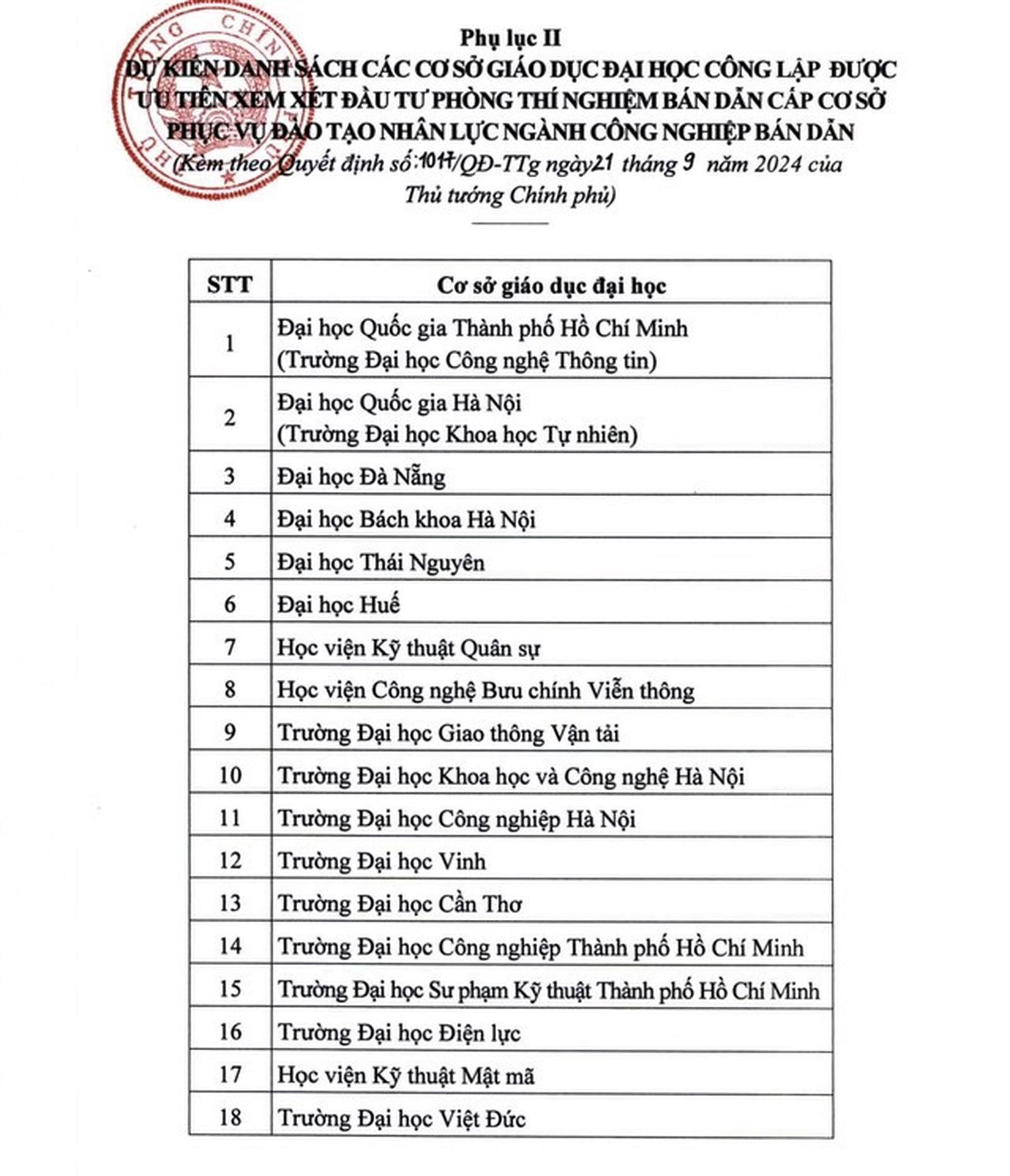 Theo đó, trong danh sách dự kiến 18 cơ sở giáo dục đại học công lập được ưu tiên xem xét đầu tư phòng thí nghiệm bán dẫn cấp cơ sở phục vụ đào tạo nhân lực ngành công nghiệp bán dẫn có Trường Đại học Điện lực.