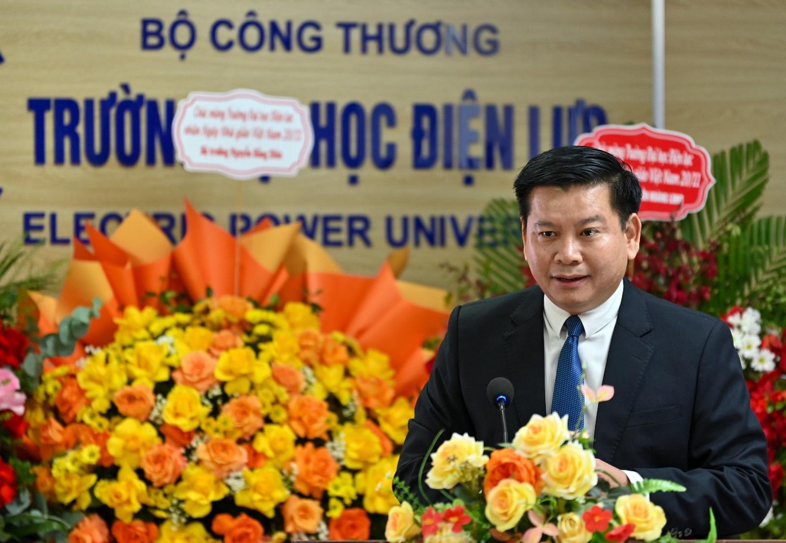 Thứ trưởng Nguyễn Hoàng Long gửi lời chúc mừng nồng nhiệt tới tập thể lãnh đạo, cán bộ viên chức, người lao động cùng sinh viên Trường Đại học Điện lực. Ảnh: Nam Nguyễn
