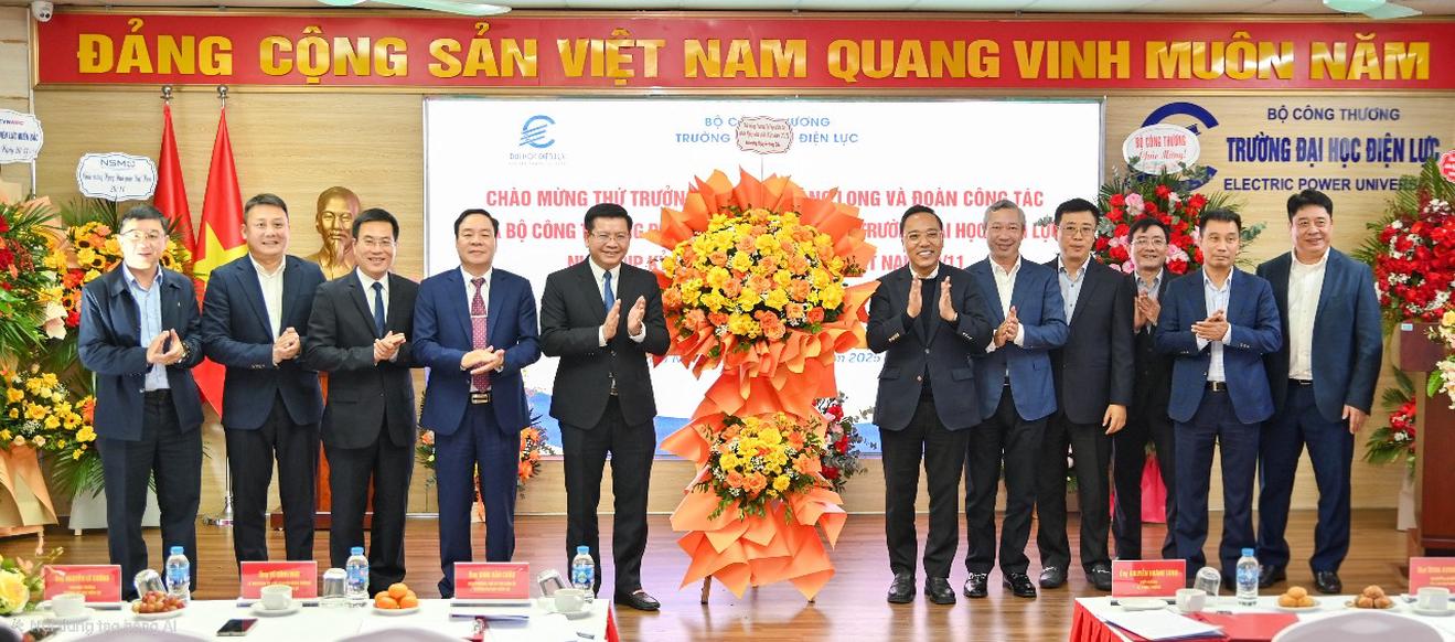 Thứ trưởng Nguyễn Hoàng Long tặng hoa chúc mừng Trường Đại học Điện lực. Ảnh: Trần Đình