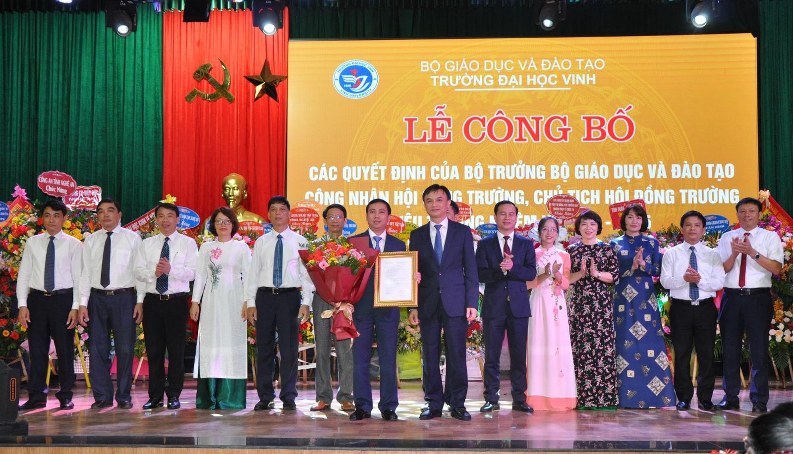 Tại buổi lễ, đại diện Vụ Tổ chức cán bộ, Bộ GD&ĐT cũng đã công bố và trao Quyết định số 1626/QĐ-BGDĐT về việc công nhận Hội đồng Trường, Chủ tịch Hội đồng Trường Trường Đại học Vinh, nhiệm kỳ 2020 - 2025. Theo đó, Hội đồng Trường Trường Đại học Vinh nhiệm kỳ 2020 - 2025 gồm 19 thành viên; TS Nguyễn Ngọc Hiền - Bí thư Đảng ủy nhiệm kỳ 2020 - 2025, Phó Hiệu trưởng nhiệm kỳ 2015 - 2020 được bầu làm Chủ tịch Hội đồng Trường.