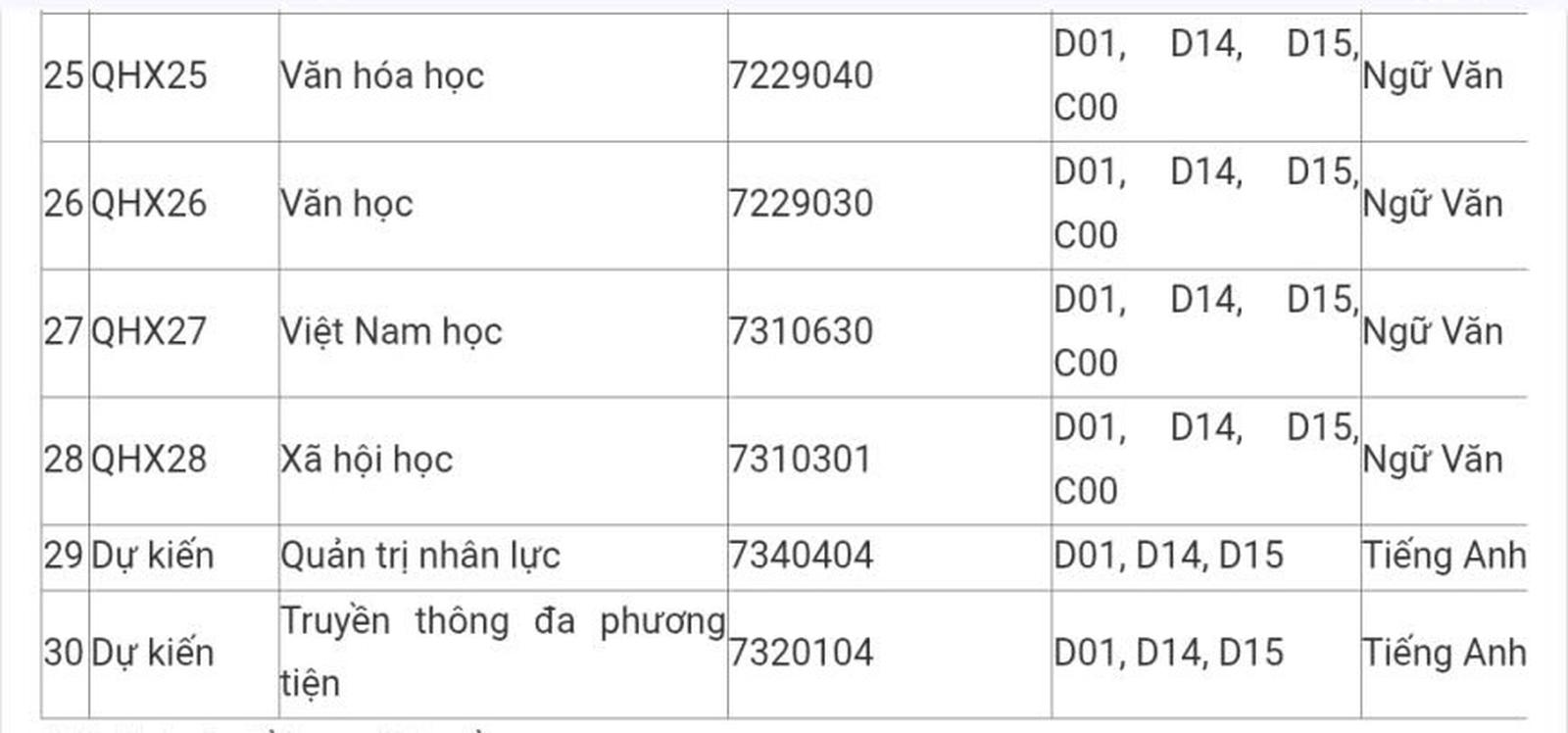 Tổ hợp xét tuyển trường Đại học Khoa học Xã hội và Nhân văn Hà Nội năm 2026. Ảnh chụp màn hình