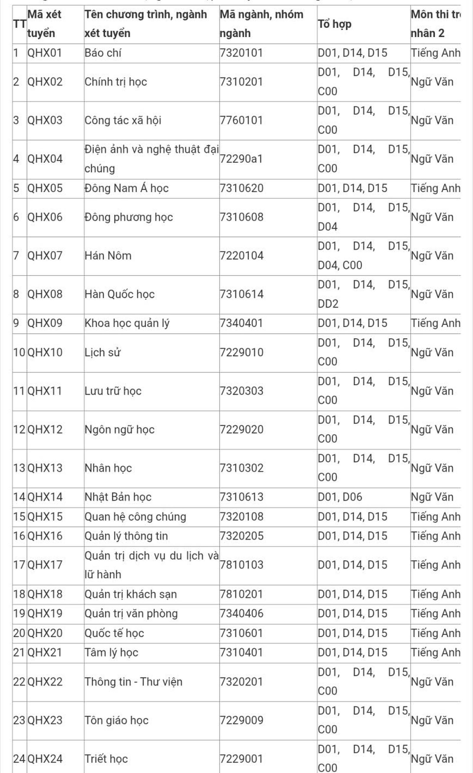 Môn thi các tổ hợp xét tuyển cụ thể: D01 (Toán, Văn, tiếng Anh), D04 (Toán, Văn, tiếng Trung), DD2 (Toán, Văn, tiếng Hàn), D06 (Toán, Văn, tiếng Nhật), D14 (Văn, tiếng Anh, Sử), D15 (Văn, tiếng Anh, Địa), C00 (Văn, Sử, Địa).