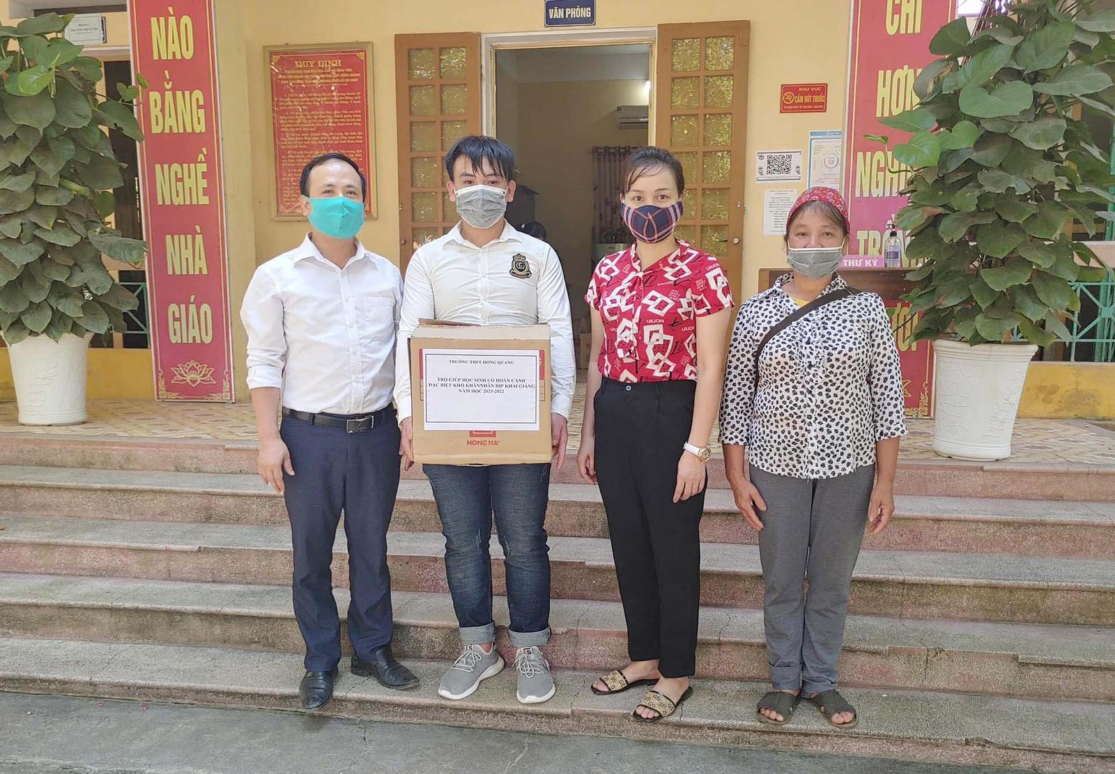 Đại diện Ban Giám hiệu Trường THPT Hồng Quang trao quà của nhà tài trợ và hỗ trợ cho học sinh có hoàn cảnh đặc biệt khó khăn. Ảnh: LP